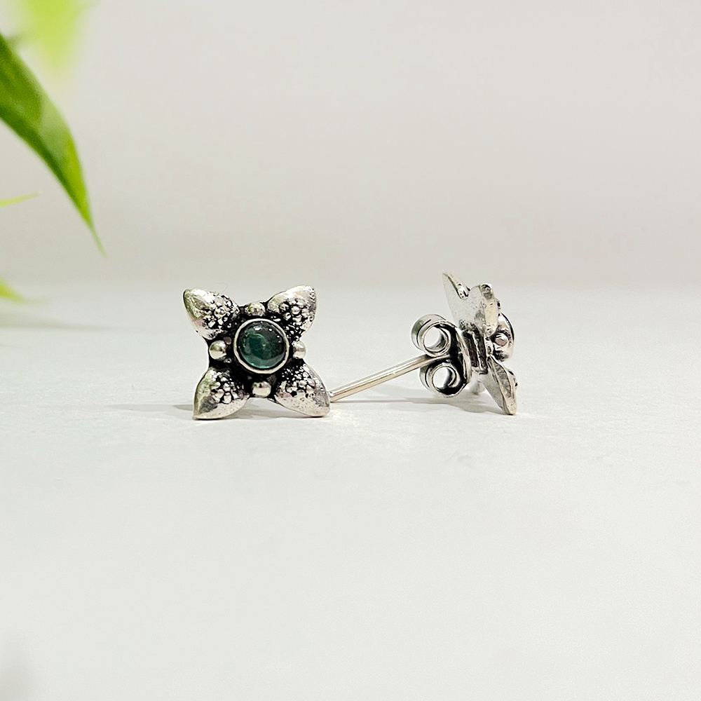 This handcrafted sterling silver earring presents a floral form centered with a green stone set within an oxidised surface. The compact structure highlights traditional detailing while remaining suitable for everyday wear. Designed for buyers who appreciate nature inspired motifs and artisan jewellery this piece works well for personal styling and curated retail selections. Each unit is carefully finished by hand. Packed and quality checked by Indianshelf.