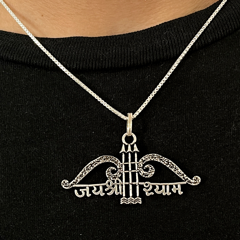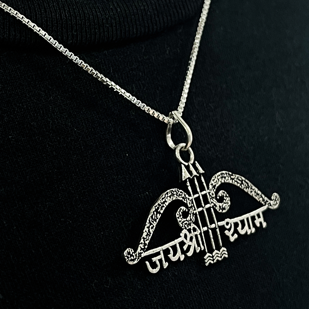This handcrafted sterling silver pendant with chain features the sacred Jai Shree Shyam inscription shaped with ornamental curves and balanced symmetry. The open form highlights devotional expression while remaining lightweight and suitable for regular wear. Created for devotees and collectors who value spiritual symbolism and artisan jewellery this pendant fits personal devotion and curated retail selections. Each piece is finished by hand. Packed and quality checked by Indianshelf.
