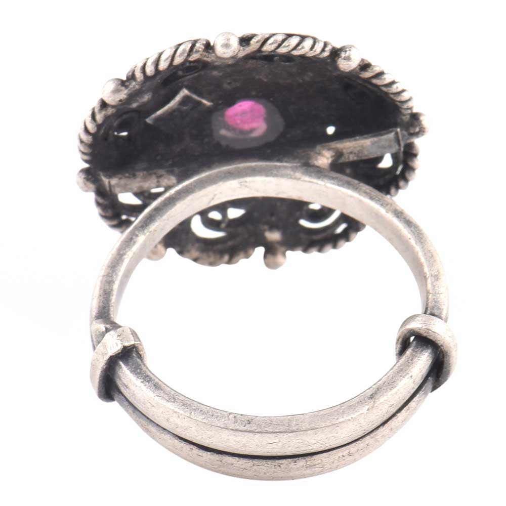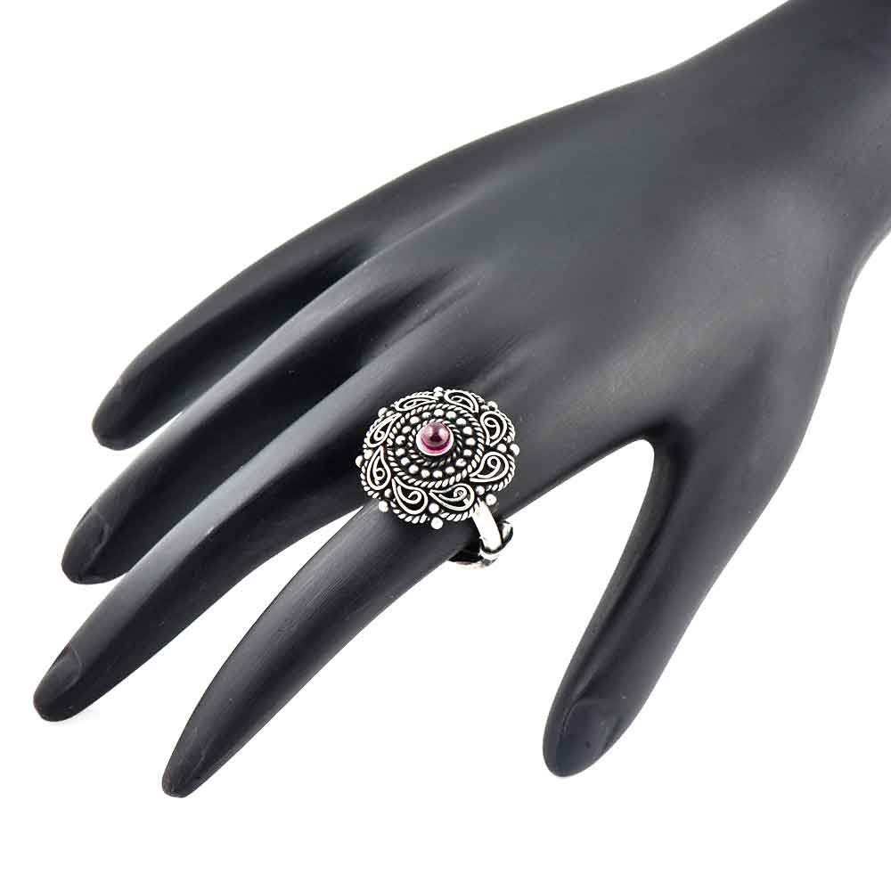 Intricate 92.5 Sterling Silver ring with double rope design with a round amethyst stone surrounded by double rope around the stone and paisley design in the border. Christmas party wear, Birthday party wear, New year party wear, graduation ceremony etc.