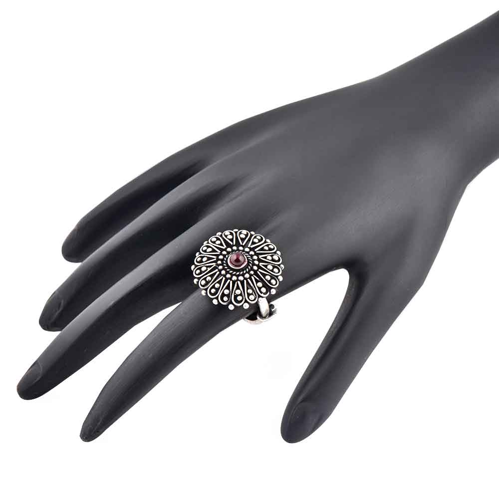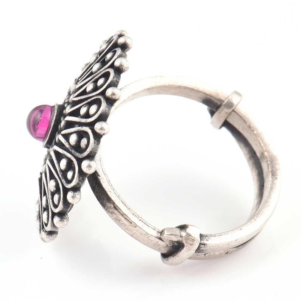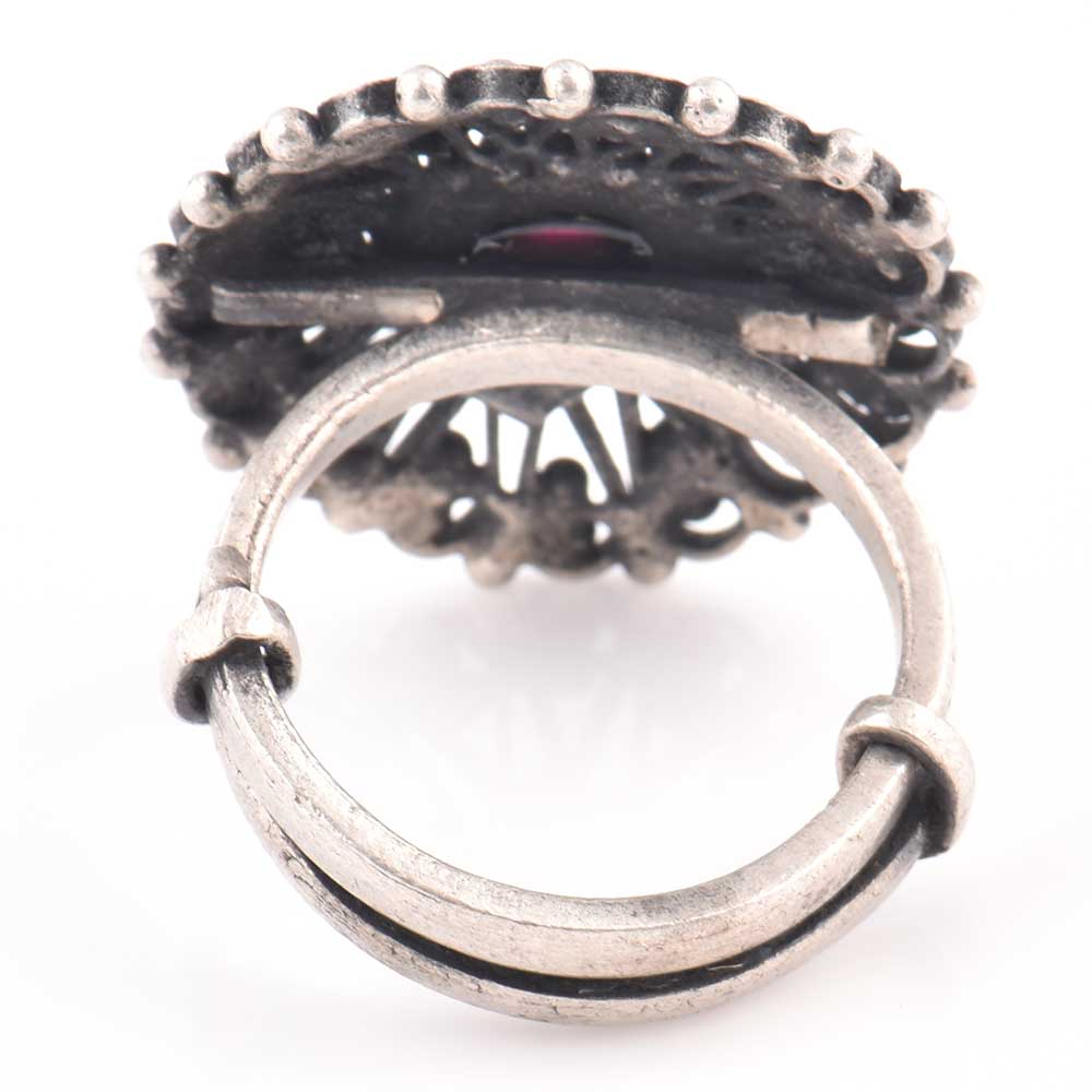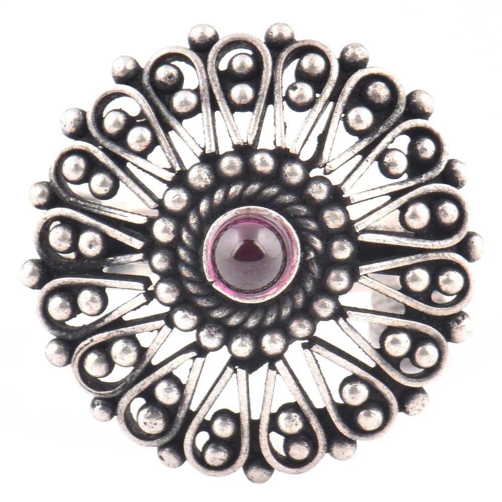 Be the centre of attraction by wearing this 92.5 Sterling Silver ring with a attractive floral pattern all around the round amethyst stone in the shape of a blooming flower. Gift it to your sister, mother, friend, girlfriend and the best part is that it can be adjustable to the size of the finger.