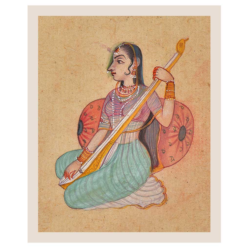 As a nayika (archetypal heroine), this figure personifies the ideal of feminine beauty as conceptualized in Indian devotional poetry of the period. She strums a tanpura and wears elaborate jewellery and sheer textiles, clearly placing her as a member of the court