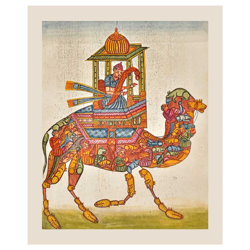 A mughal camel rider sits on a composite Camel comprised of courtiers, fishes, twofaced horse, rats completes its body and four crab legs appear as "shoes" on its feet. Fanciful depictions of composite animals particularly elephants, camels and horses likely had originally come to India via Persian and Indo-Islamic sources - however here our mahout is a mughal servant .The stylistic provenance of this work is elusive, with elements of Deccan, Rajasthan and Pahari elements intermixing, like the composite subject itself.