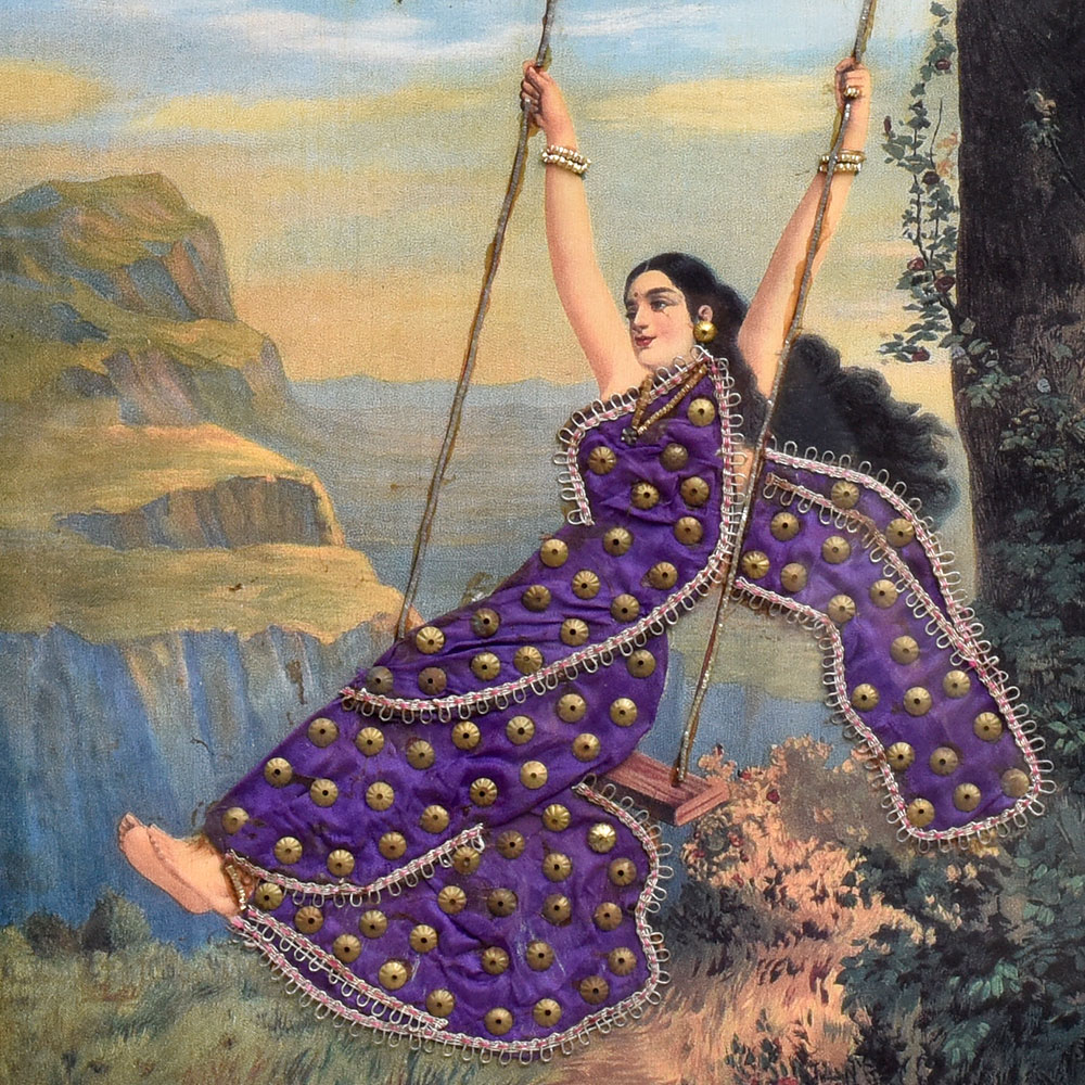 - Breathtaking oil painting of a lady on a swing, surrounded by ornate clothing and fabrics