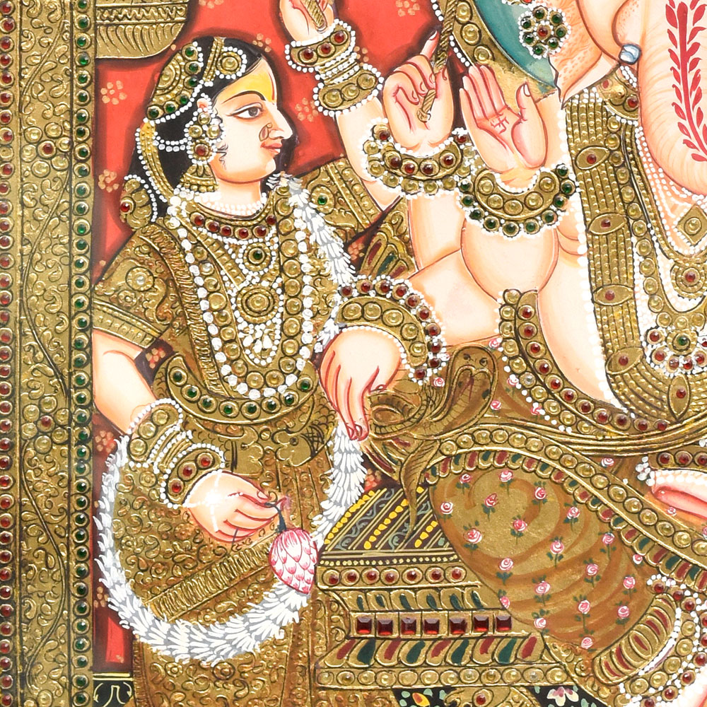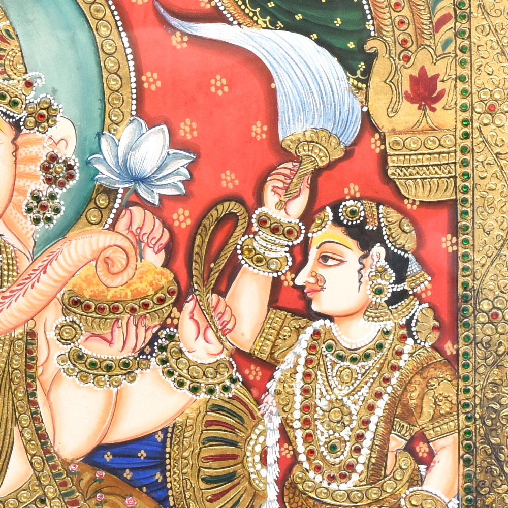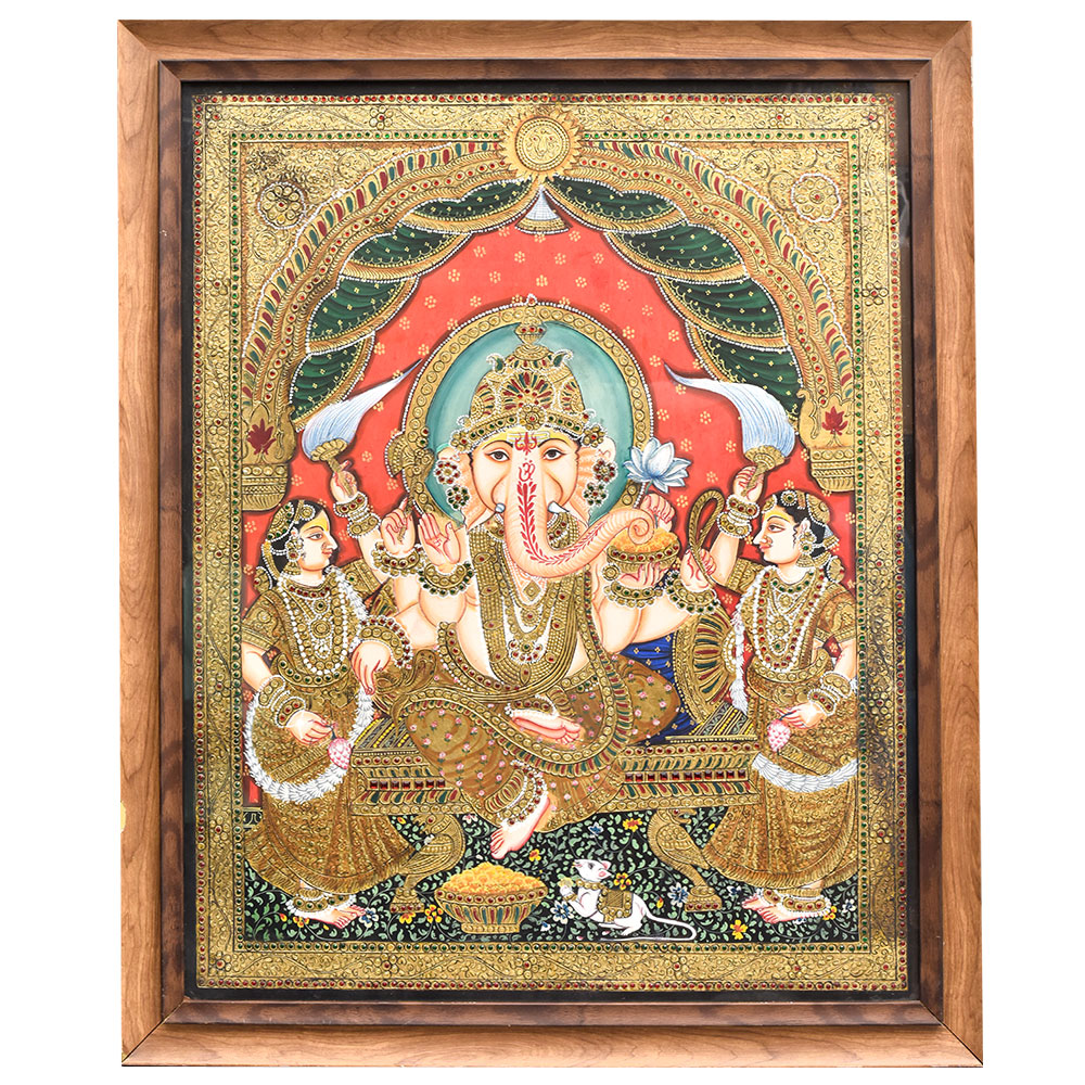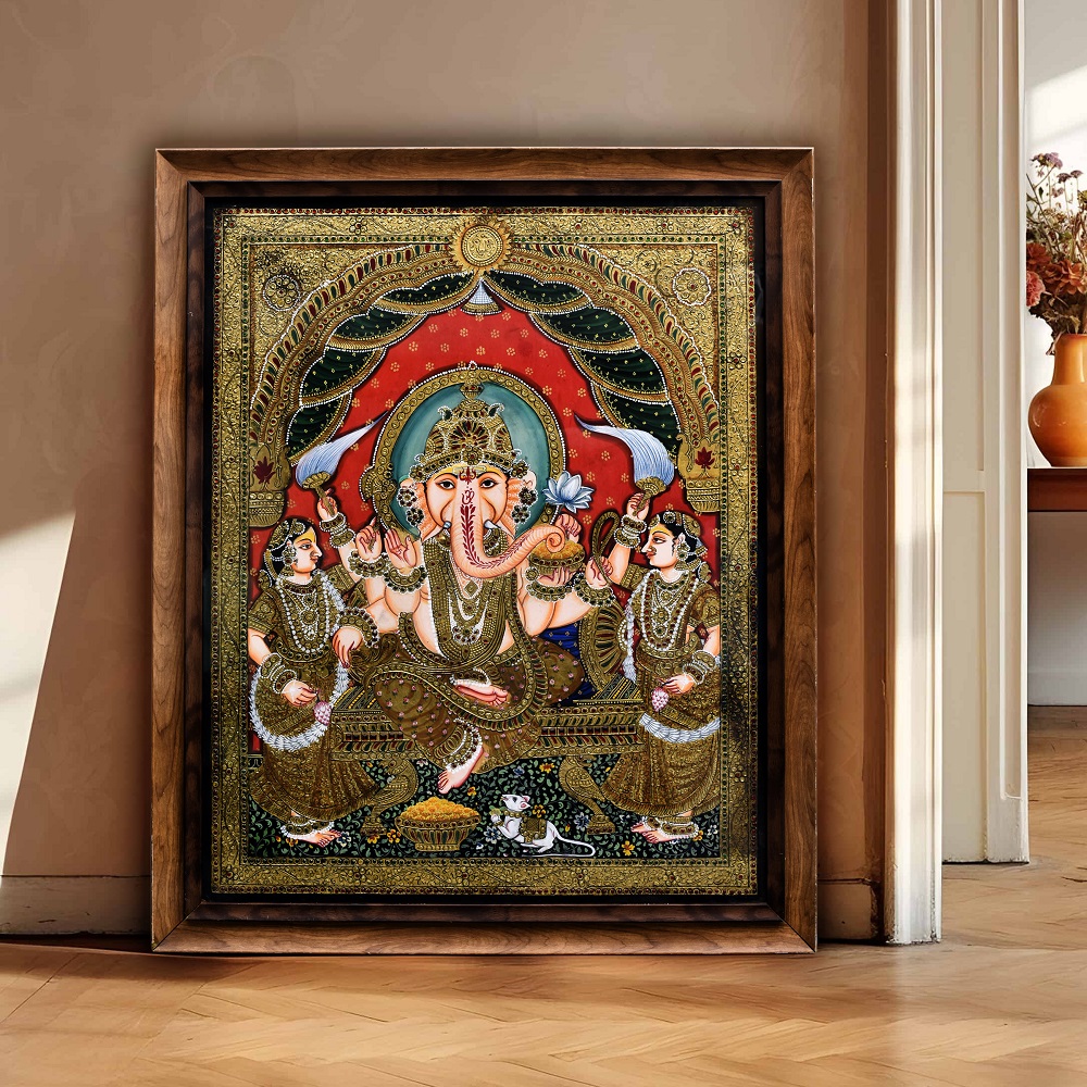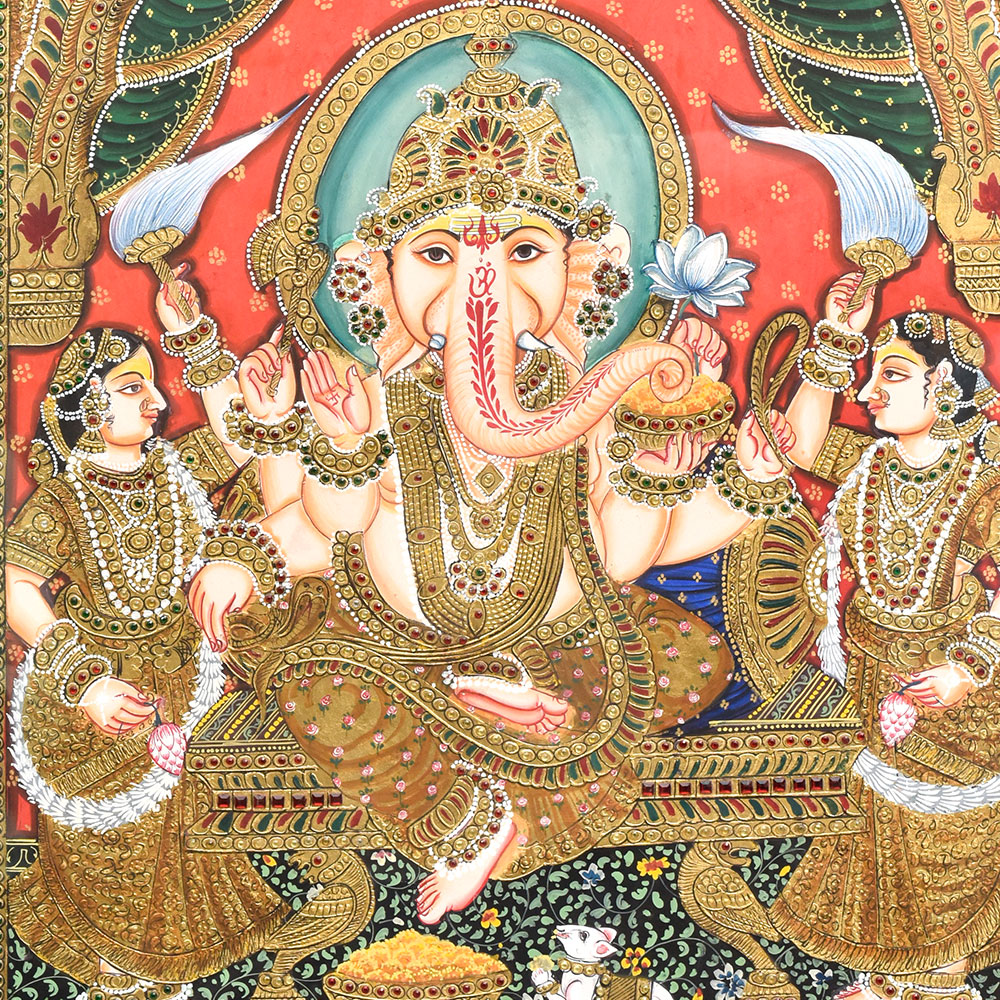 As you gaze upon the serene, benevolent countenance of Lord Ganesha, you'll be infused with a sense of inner peace, prosperity, and the removal of any impediments to your success. Whether you're a devoted Hindu or simply appreciate the beauty of Indian artistic heritage, this Tanjore painting is a true treasure that will elevate any space and nourish your soul. Prepare to be captivated by the radiant visage of Lord Ganesha, the beloved elephant-headed deity, in this stunning Tanjore-style painting. Crafted with meticulous attention to detail, this work of art seamlessly blends the timeless spirituality of the remover of obstacles with the rich, vibrant hues and intricate gilded work that define the Tanjore painting tradition.