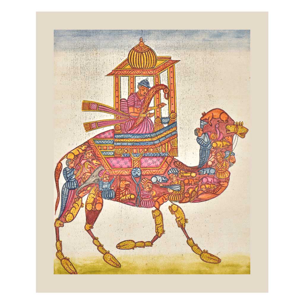 A mughal camel rider sits on a composite Camel comprised of courtiers, fishes, twofaced horse, rats completes its body and four crab legs appear as "shoes" on its feet. Fanciful depictions of composite animals particularly elephants, camels and horses likely had originally come to India via Persian and Indo-Islamic sources - however here our mahout is a mughal servant .The stylistic provenance of this work is elusive, with elements of Deccan, Rajasthan and Pahari elements intermixing, like the composite subject itself.
