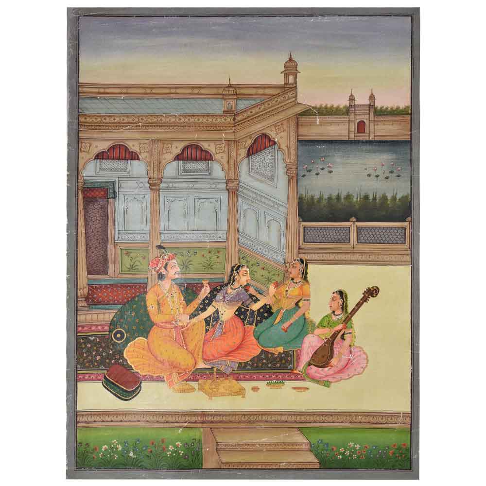 We present to you a traditional Mughal miniature artwork originating in the Indian state of Rajasthan - (historically noted as the epicentre of Mughal art). It was created by a single set of skilled artisan hands working with brilliant opaque watercolours on stamp paper. (This is a handmade painting, not a print.) The small artwork depicts the Mughal Emperor courting his queen and her courtiers in great detail. The scenario is completed by a glass of wine. A lovely addition to your home's decor.