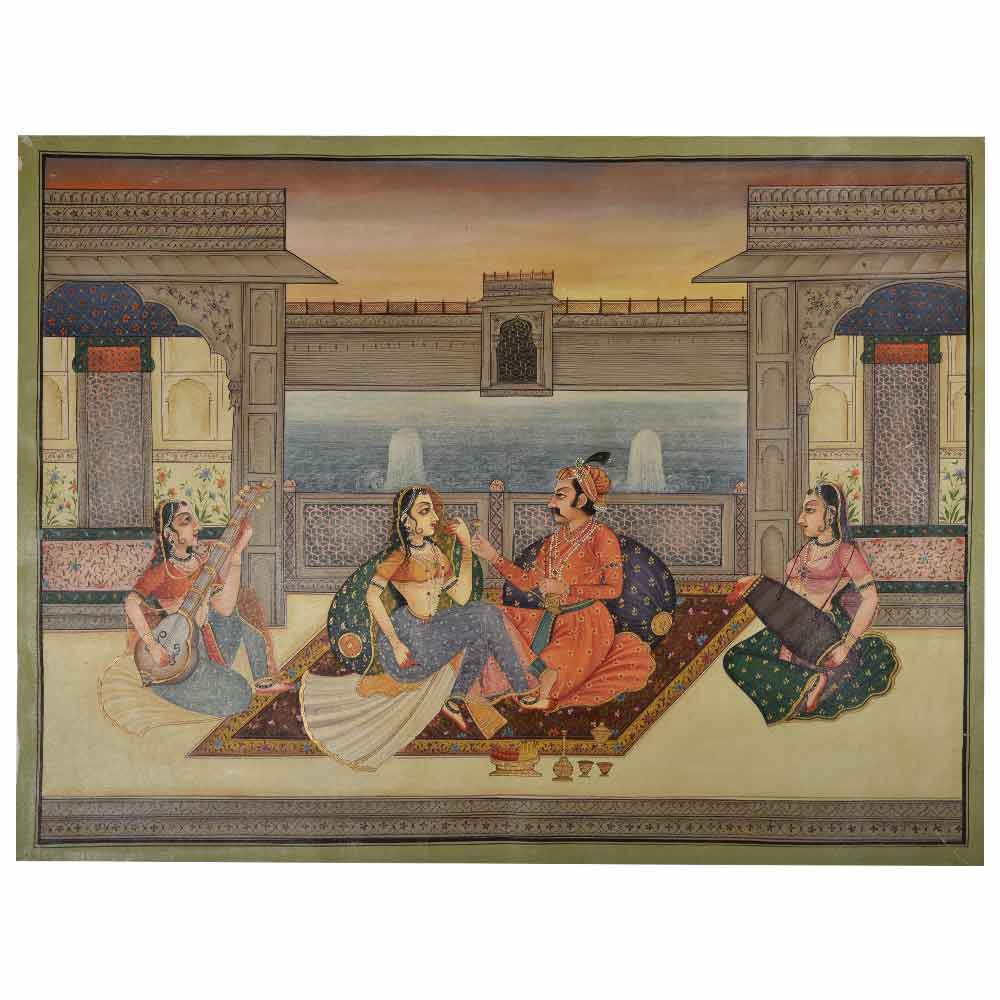 This multi-coloured magnificent Mughal love scene is a work of art and a must-have for the walls of your dream home. This Painting of a Mughal romance on canvas in acrylic colours shows that the maharajas enjoyed their line with wine and women. This is a very good piece of art painted on canvas with acrylic colours depicting a Mughal maharajah enjoying his leisure time and romance with music and drink.