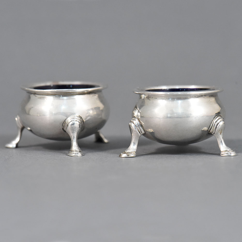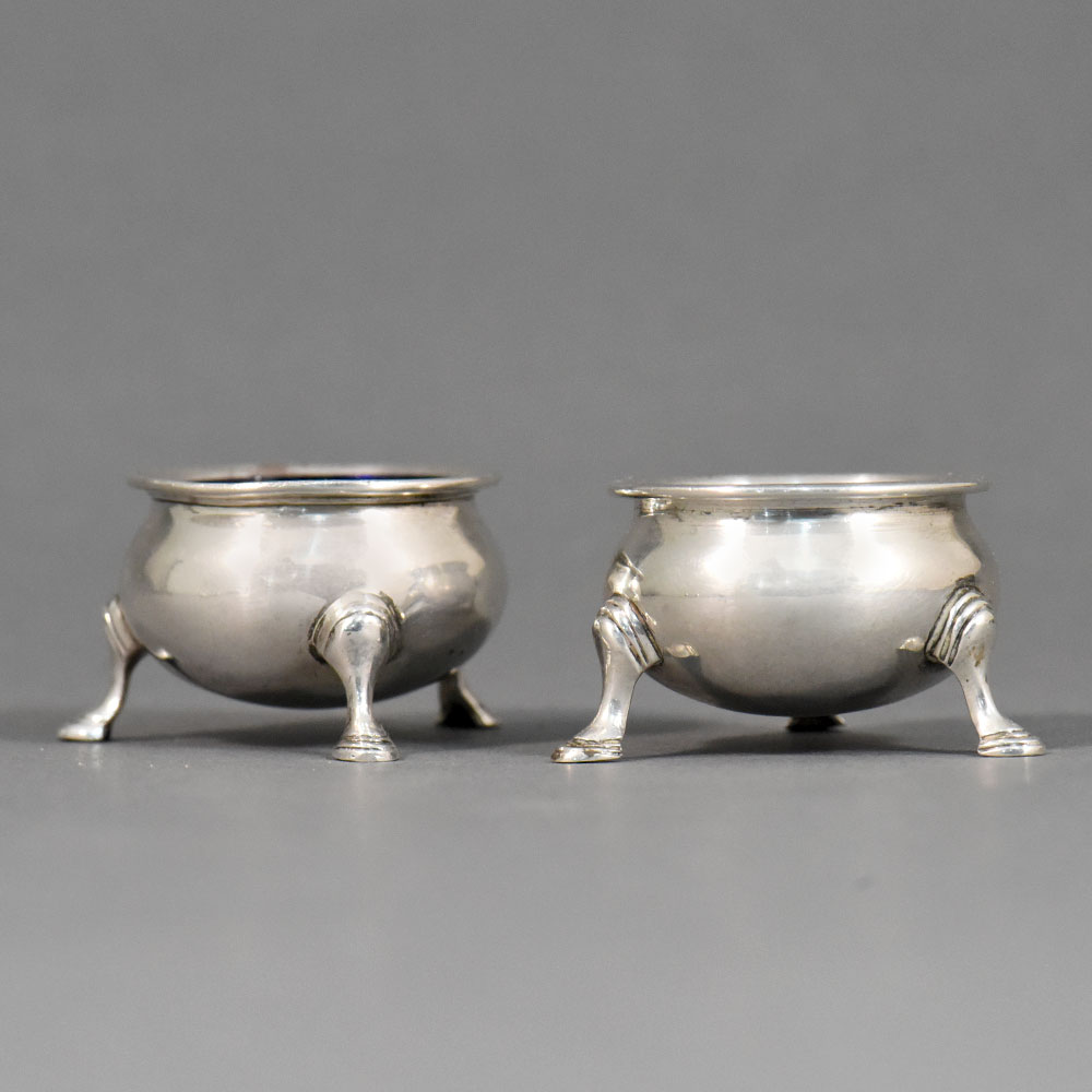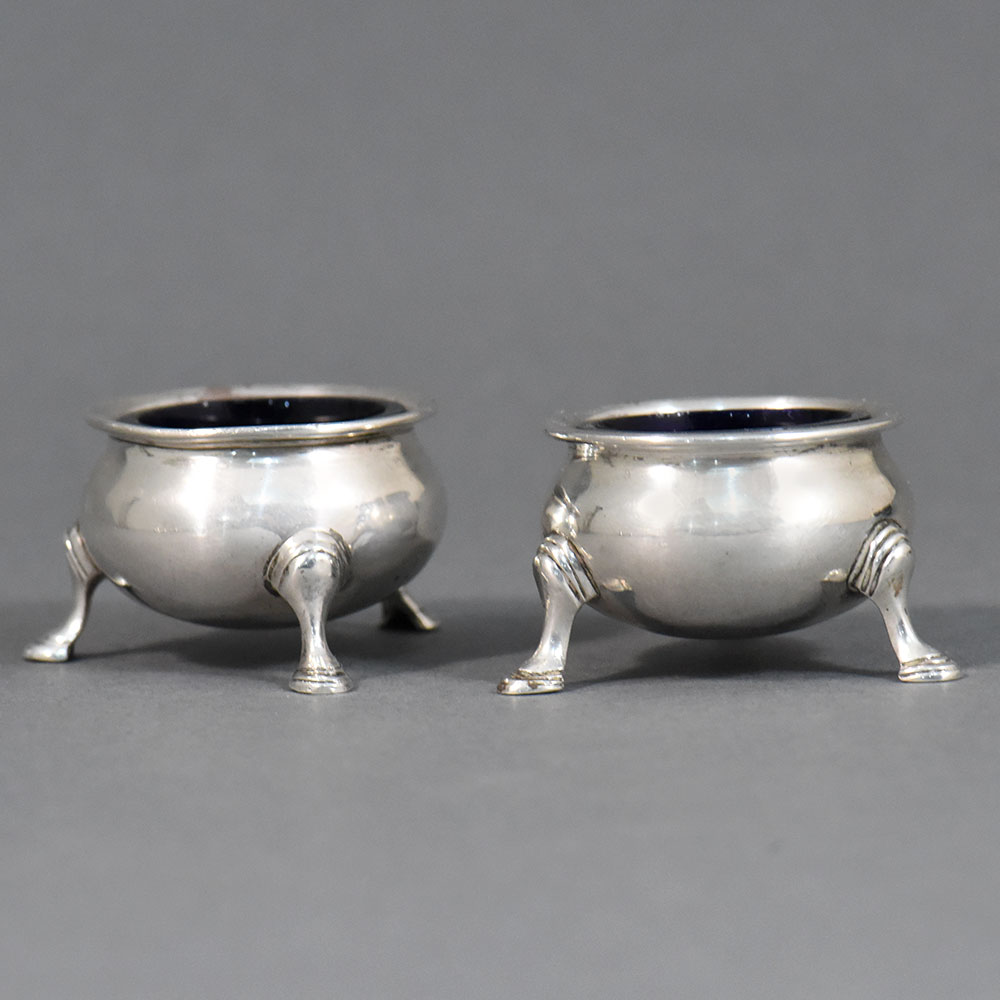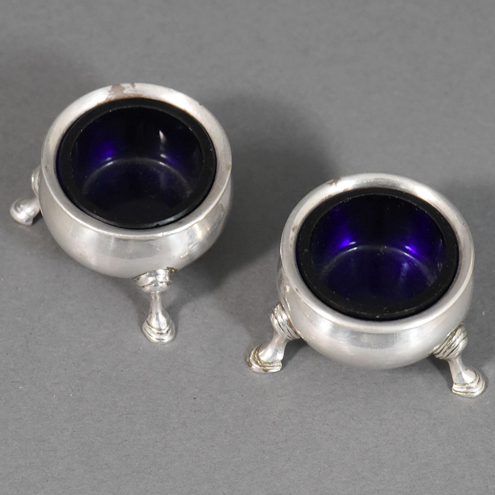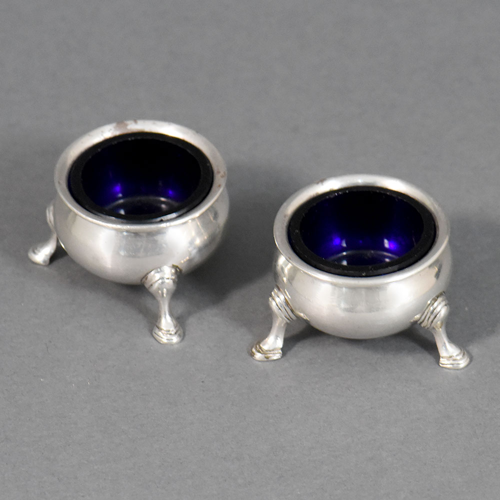 This finely crafted pair of sterling silver salt cellars represents high-quality English silverwork. Each cellar is formed as a shallow rounded bowl, elegantly raised on three finely modeled tripod legs. The restrained proportions and balanced form reflect the refined neoclassical taste prevalent in English table silver of the Georgian period. The interiors retain their original deep cobalt blue glass liners, a traditional and practical feature designed to protect the silver from the corrosive effects of salt while adding a rich visual contrast to the polished exterior. The silver surfaces show subtle hand-finishing, consistent with craftsmanship of the period. The underside of each cellar bears a clear and complete set of English hallmarks, allowing for confident attribution and dating: