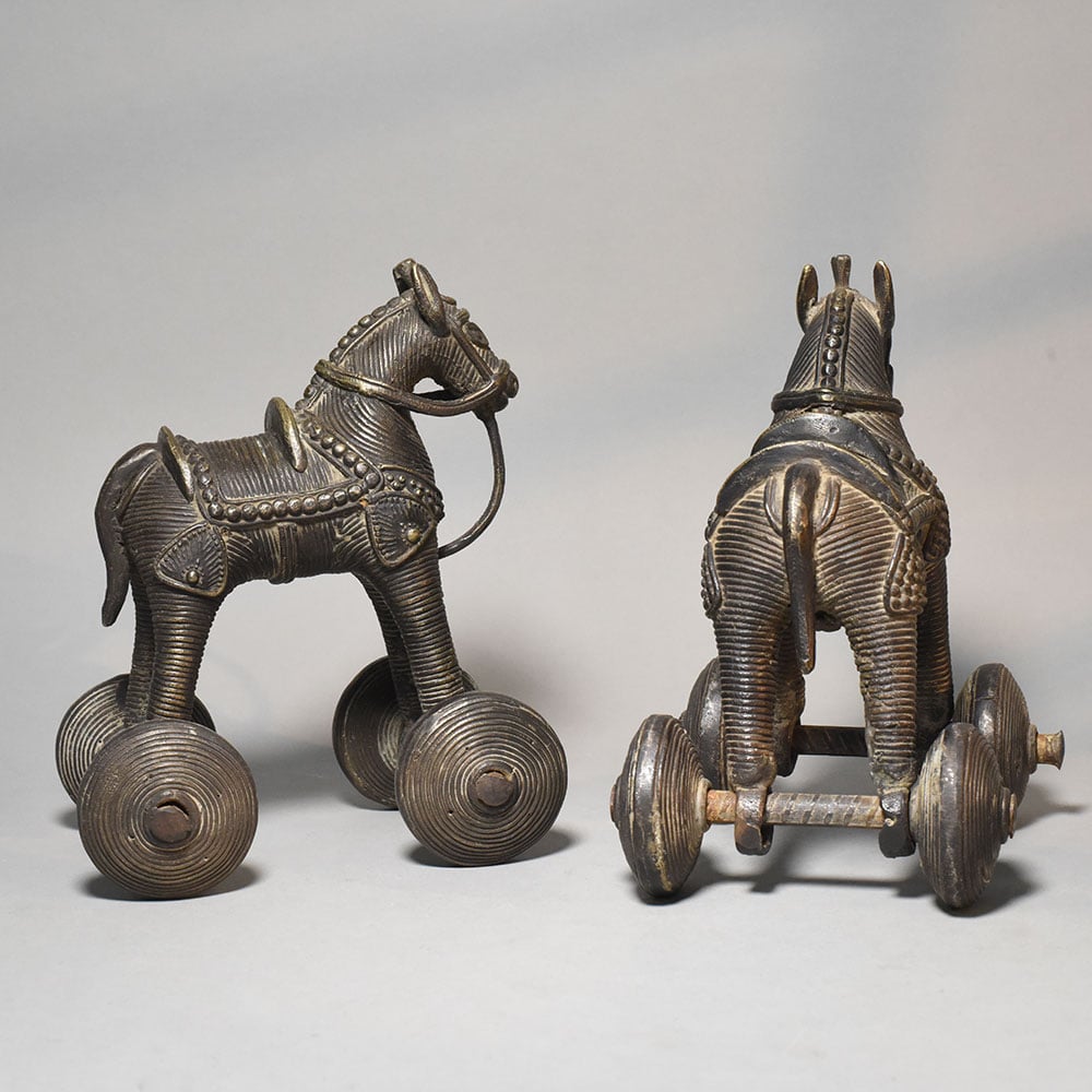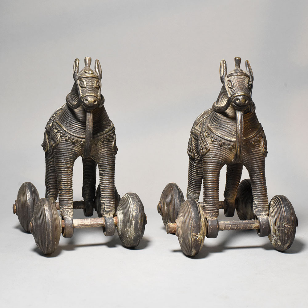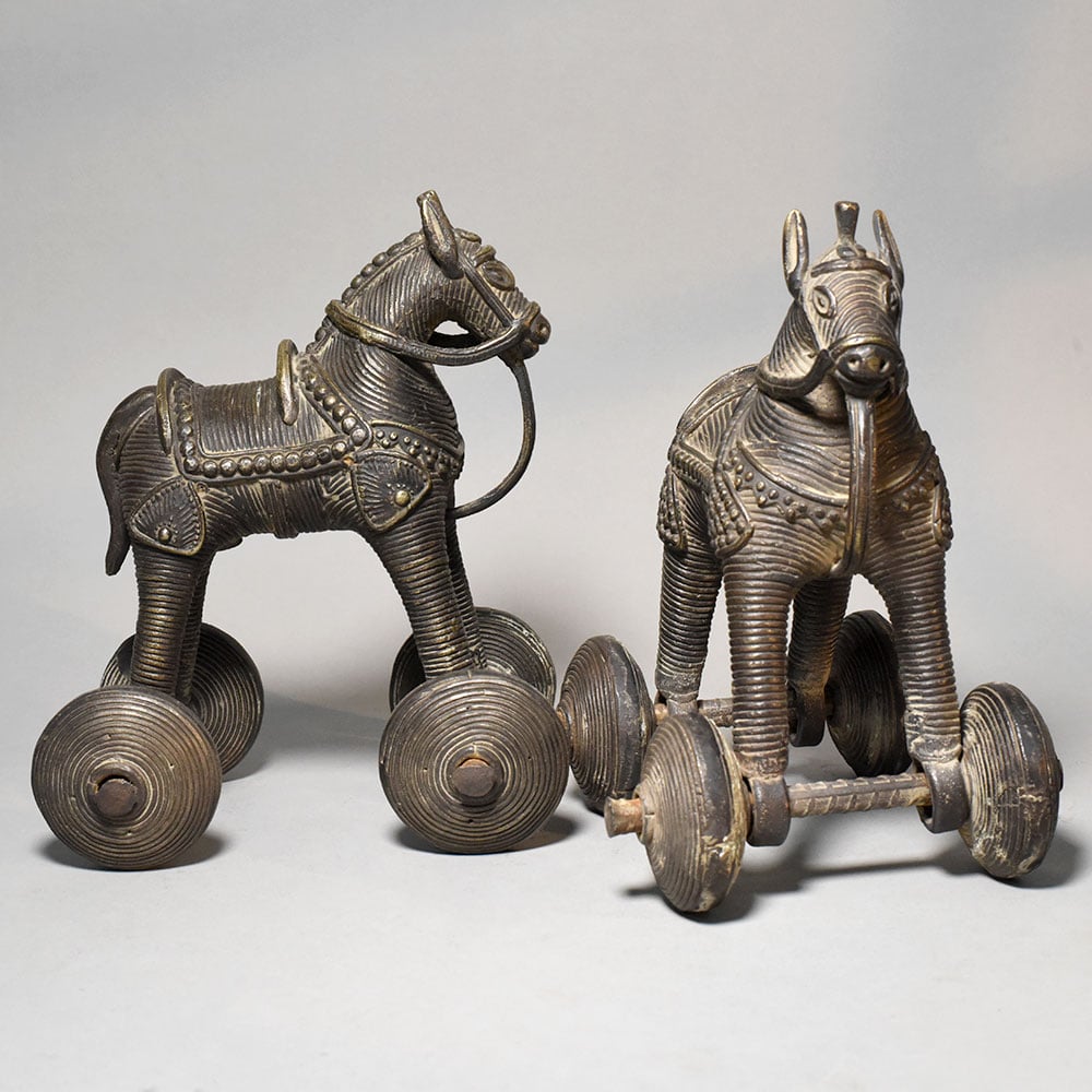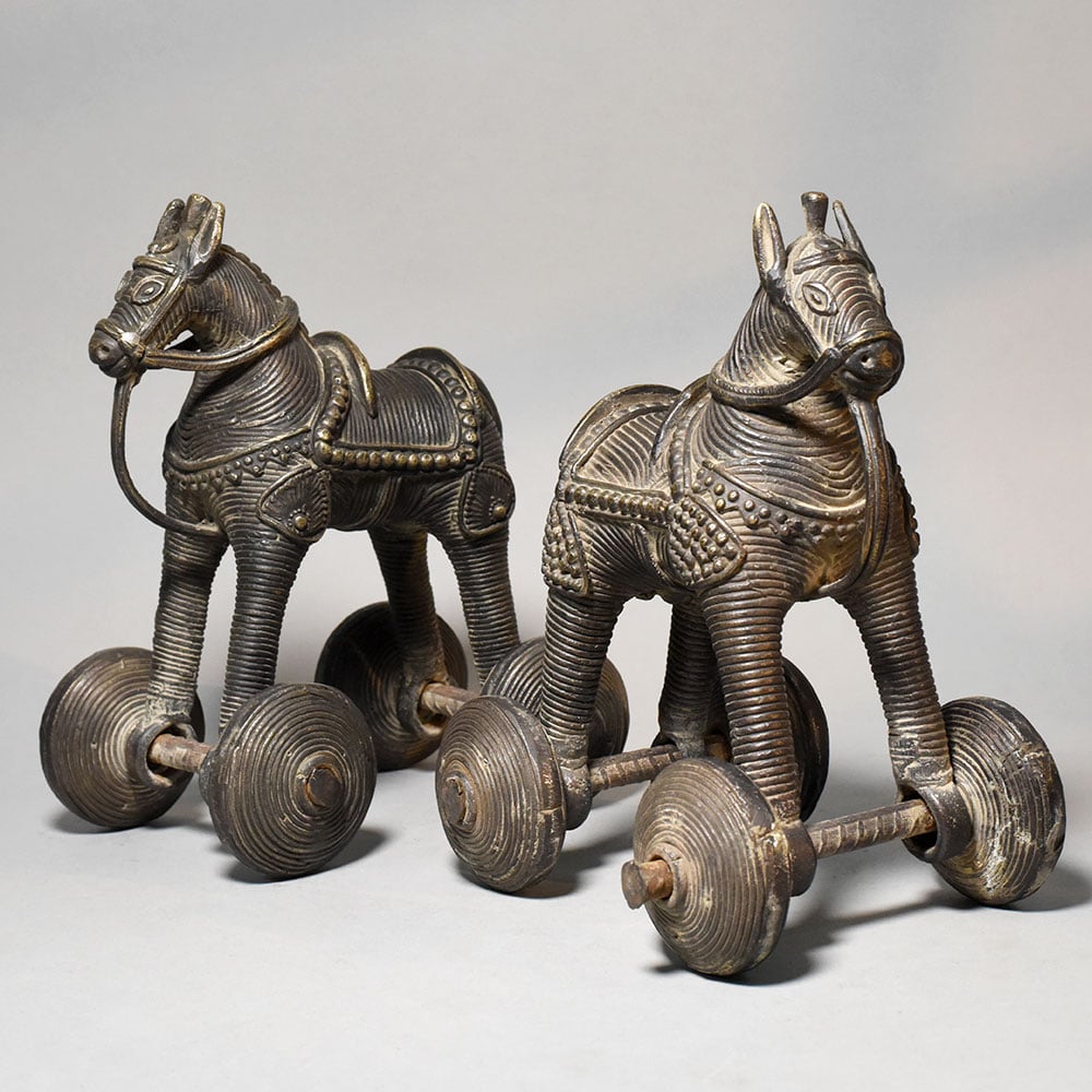 This pair of vintage brass horse rolling toy figurines showcases traditional Indian folk craftsmanship combined with charming mechanical design. Each figurine features a stylized horse mounted on four metal wheels, creating a collectible object that blends sculpture with movement. The horses are richly detailed with engraved textures across the body, including decorative saddles, harness patterns, and stylized facial features. The upright stance and elongated legs give the figures a strong and balanced appearance, reflecting the artistic simplicity found in traditional handcrafted metal toys. Mounted beneath each horse are four round brass wheels connected by metal axles, allowing the figurines to roll smoothly when pushed. Objects of this type were historically made as rolling animal toys and decorative collectibles, often representing animals associated with strength, speed, and mobility. The brass surface displays a dark antique patina with natural wear and highlights that emphasize the carved details and textured wheel patterns. These aged tones enhance the vintage character of the pieces and highlight their handcrafted quality. Ideal for collectors of traditional artifacts, vintage dcor enthusiasts, or heritage-themed interiors, this pair of rolling brass horse figurines makes a distinctive display for shelves, desks, or curio cabinets.