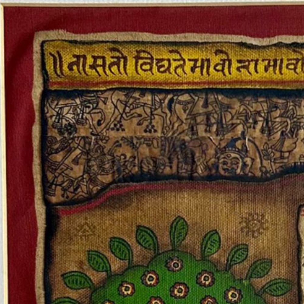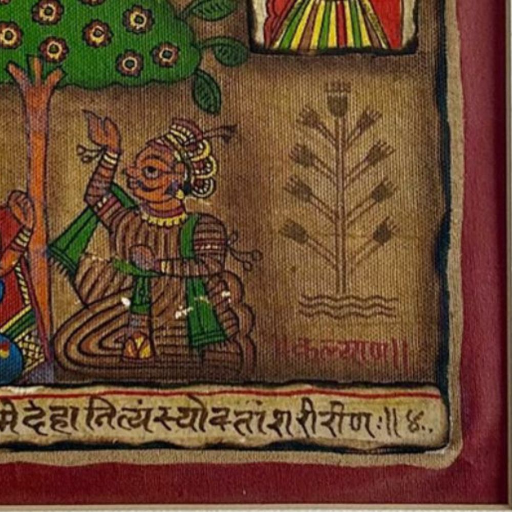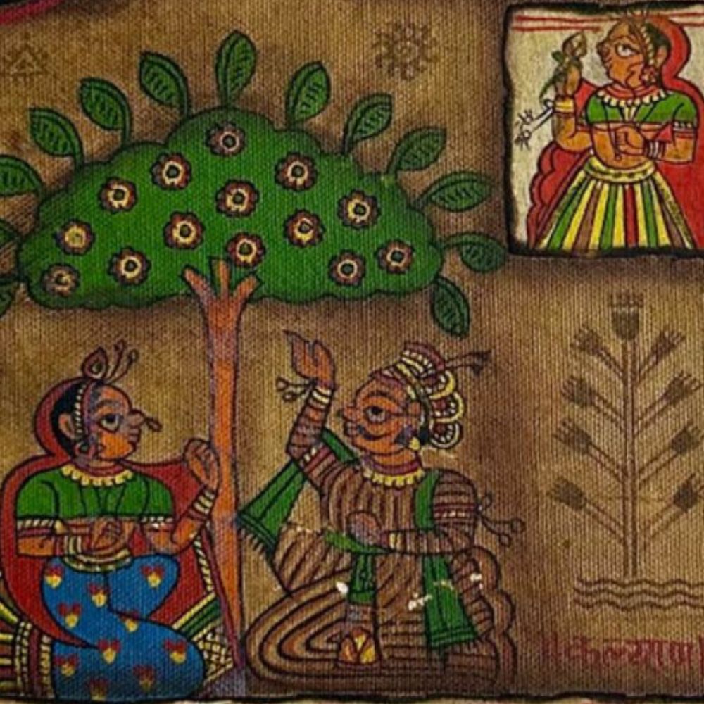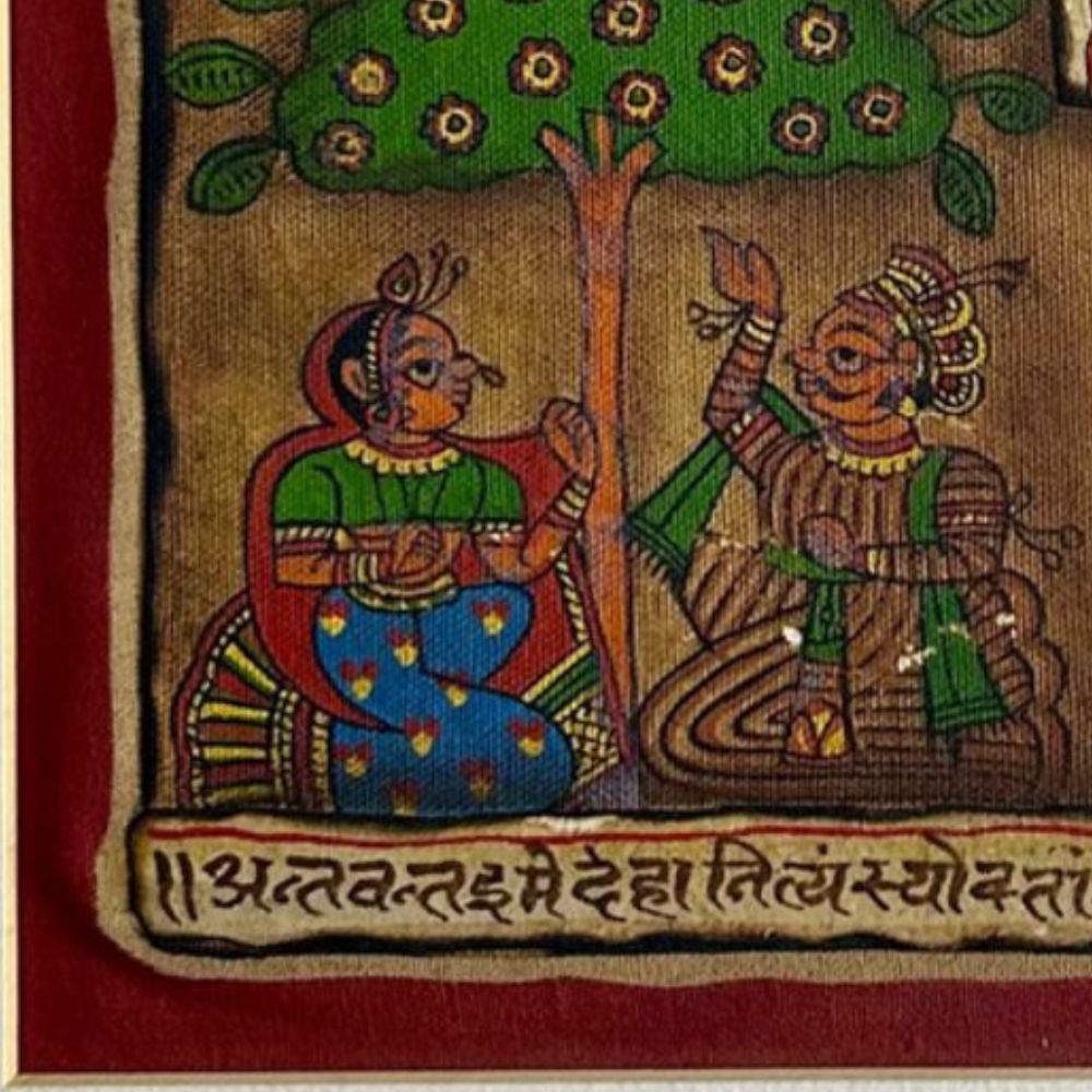"Pair" is a captivating Phad Painting in raw colour on cloth, deeply rooted in the folk traditions of Rajasthan. Phad paintings are renowned for their narrative style, often used by Bhopas (folk singers) to depict stories of deities, warriors, and cultural life. This artwork embraces that heritage, presenting a beautifully hand-painted scene with symbolic storytelling elements. The central composition features a couple seated under a flourishing tree, symbolizing togetherness, harmony, and the eternal bond between man and nature. The figures are adorned in traditional attire, rendered with expressive detailing and earthy tones that highlight their cultural identity. Above them, intricate miniature scenes unfold, carrying forward the essence of oral traditions, while the side portrait adds depth and continuity to the story. The raw colour pigments on the cloth surface create an organic, rustic texture that enhances the authenticity of the piece. The borders inscribed with Devanagari script further ground the painting in its devotional and narrative roots. More than an artwork, "Pair" is a piece of living heritage - a visual poem celebrating companionship, spirituality, and folk artistry.