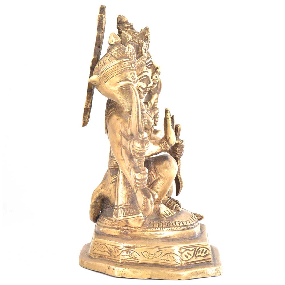The brass statue shows lord Hanuman in panchmukhi form which means five faced. Hayagriva, Narasimha, Garuda and Varaha are the four other faces along with Hanuman's face.