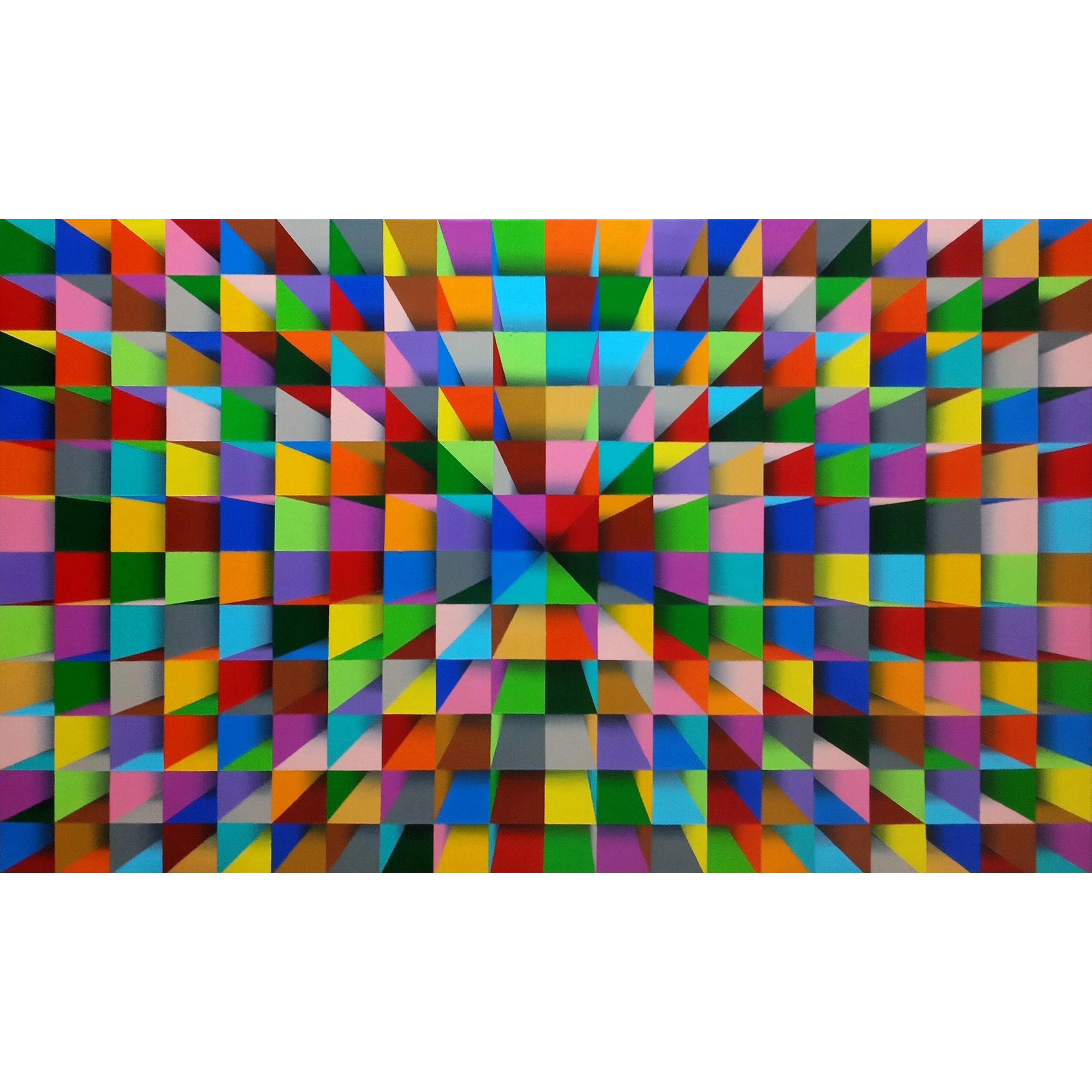 "Panorama" is a vibrant acrylic on canvas that explodes with geometric precision and color intensity. Composed of angular shapes arranged in a radiating grid, the painting draws the viewer into a dynamic, almost hypnotic perspective. Its bold palette—ranging from vivid primaries to rich pastels—creates a sense of depth and motion, evoking the illusion of a pulsating, panoramic field. Inspired by Op Art and geometric abstraction, "Panorama" challenges perception and energizes space. Each glance reveals new visual rhythms, making the piece an ever-evolving experience of form, symmetry, and chromatic harmony. It’s both a celebration of order and an invitation to explore chaos.