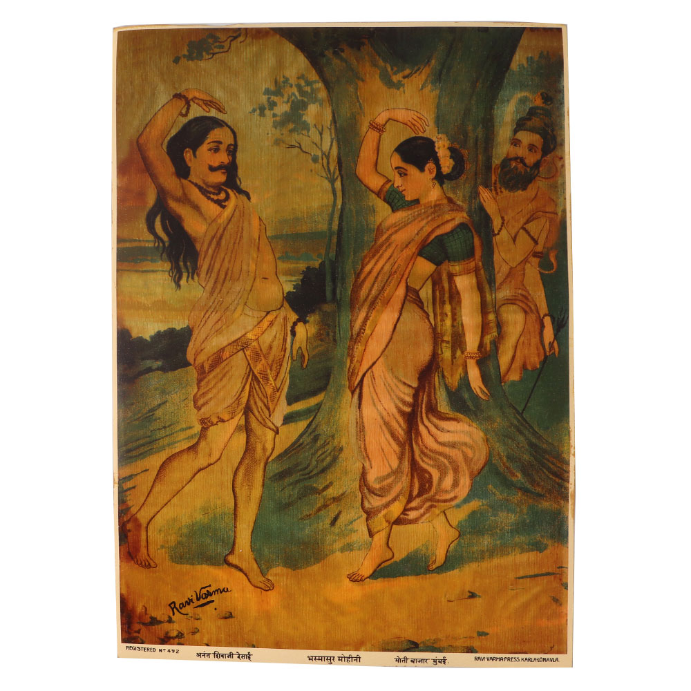 This Paper Painting of Mohni Bhasmasura By Raja Ravi Varma depicts a traditional image of the bhasmasura mohini dance. Shiva granted Bhasmasura the wish that anyone on whose head he places his hands would burn to ashes and perish. Shiva attempted to flee from Bhasmasura's test on him, but Lord Vishnu intervened in the form of the most stunning Mohini Avatar to save him. Bhasmasura was ultimately forced to commit suicide by placing his hands over his own head, and Raja Ravi Varma expertly captured this scene. The beauty of the scene was Lord Shiva standing behind the tree and watching the entire performance with a hint of anxiety and fear. It depicts a traditional image of the bhasmasura mohini dance.
