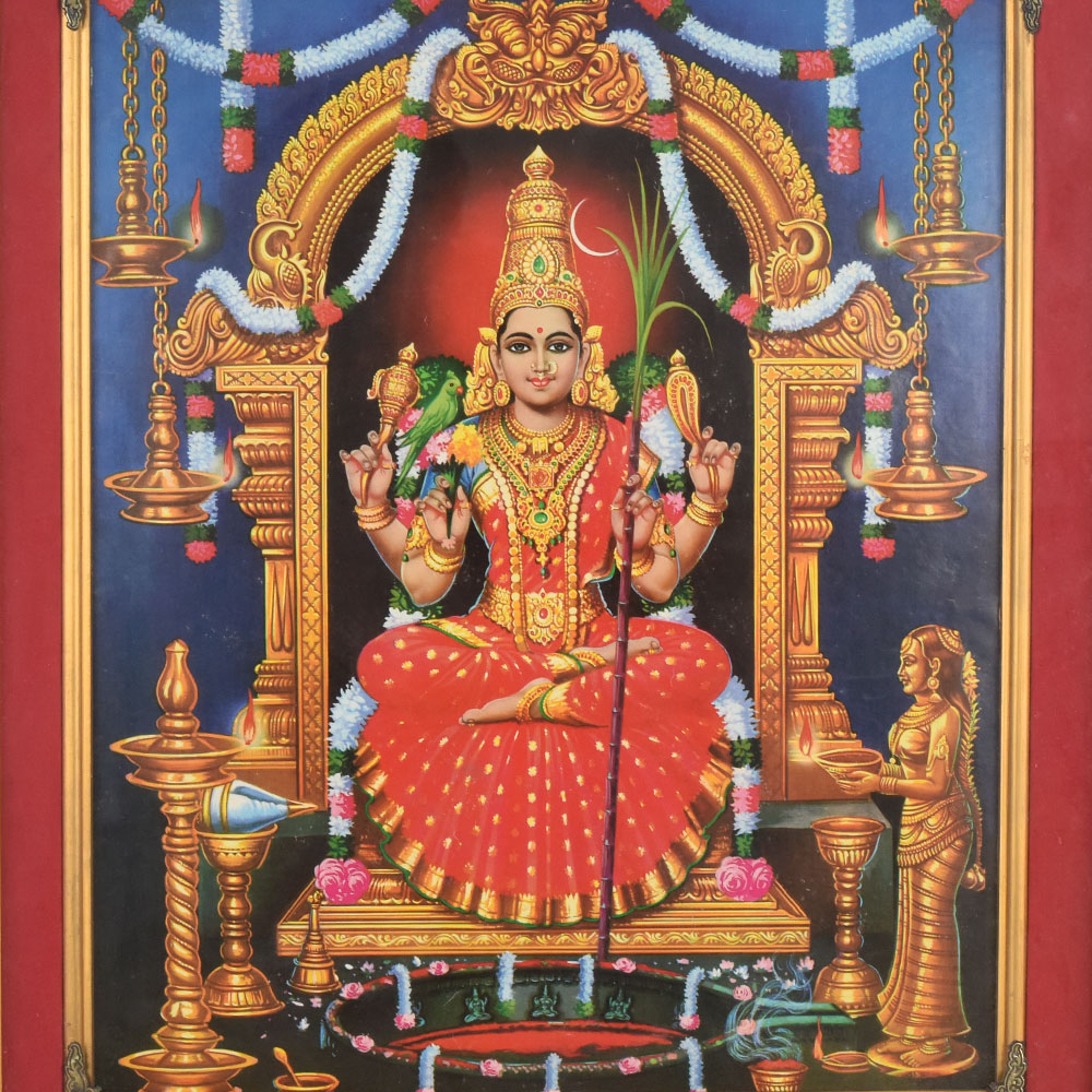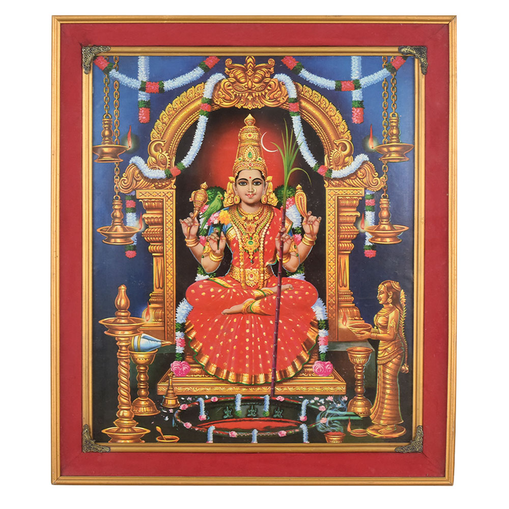 Adorn your sacred space with this stunning paper painting of Goddess Meenakshi, beautifully framed and designed in a traditional South Indian temple style. The artwork depicts the goddess seated gracefully on a golden throne, adorned with intricate jewelry, vibrant attire, and holding symbolic items that reflect prosperity and divine power. Flanked by temple lamps and attendants, the composition radiates devotion, splendor, and cultural richness. The artist’s attention to detail is evident in the ornate archway, floral garlands, and the vivid red and blue background that enhances the spiritual aura. Printed on durable paper and framed for longevity, this devotional artwork is perfect for pooja rooms, meditation areas, or as a centerpiece in your living space. It also makes a thoughtful gift for festivals, weddings, and housewarmings, spreading blessings and positivity.
