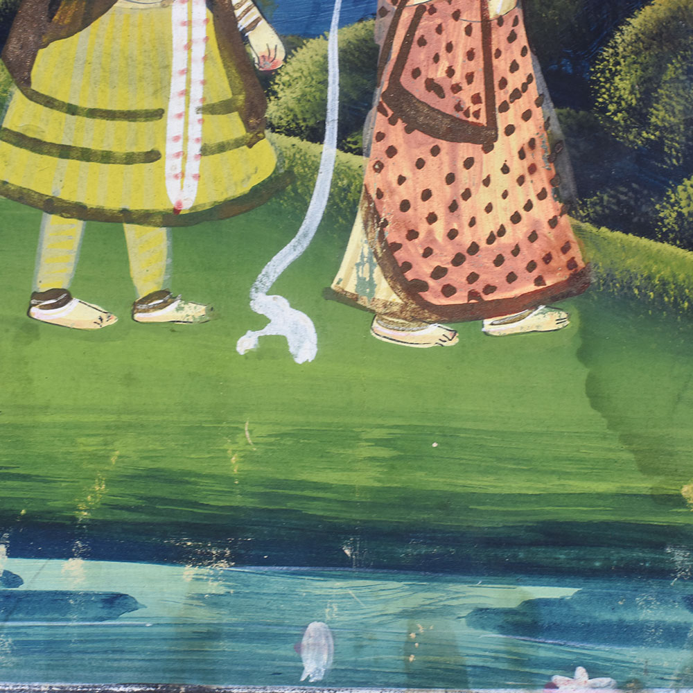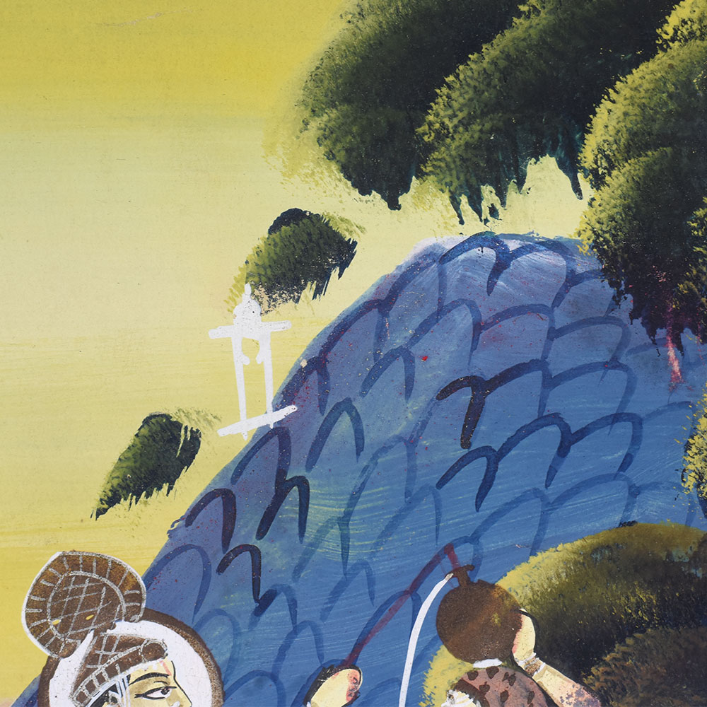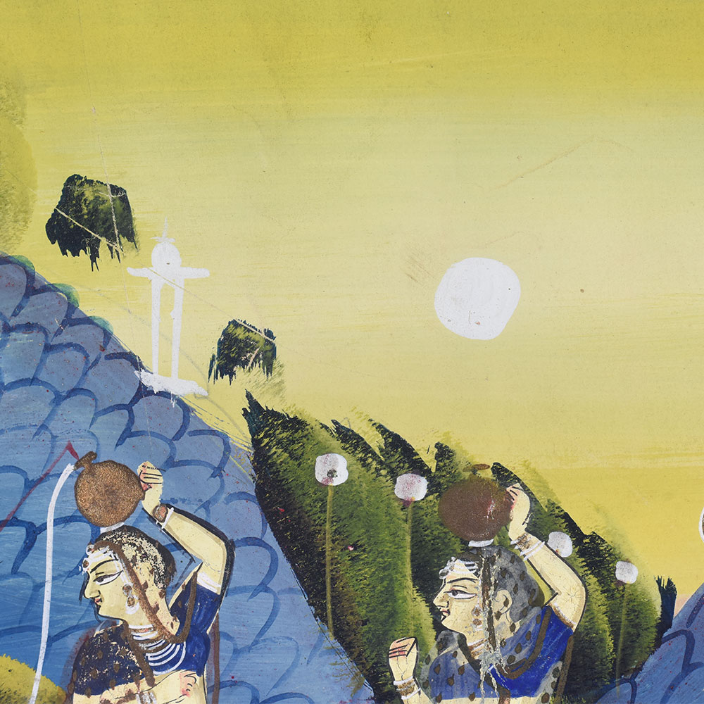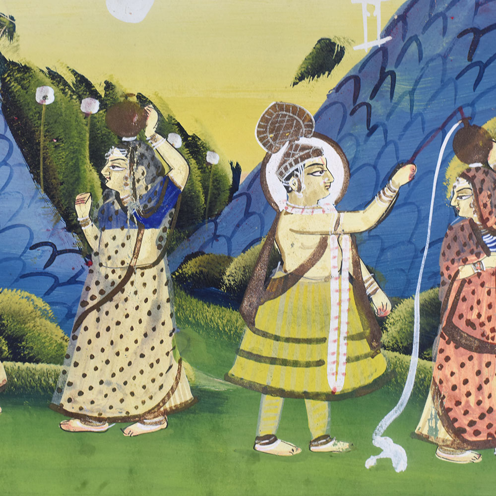 - Vibrant, hand-painted depiction of Lord Krishna and his Gopi devotees