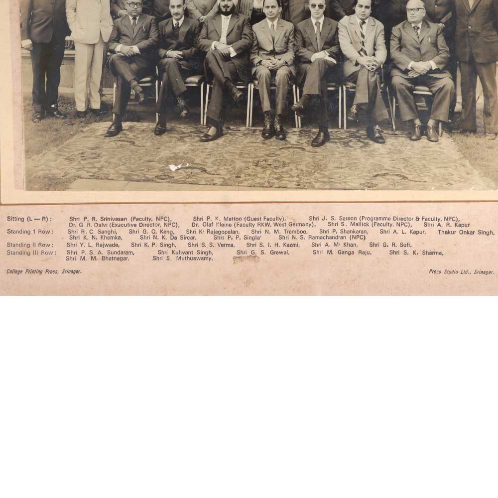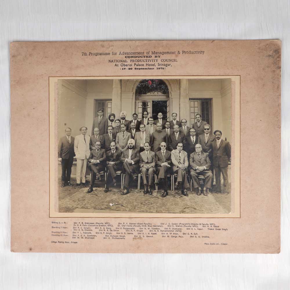 Capture the nostalgia of an unforgettable era with this vintage paper photograph from the 1970s. This striking black-and-white group photo commemorates the "7th Programme for Advancement of Management and Productivity" conducted by the National Productivity Council at Oberoi Palace Hotel, Srinagar from September 17-29, 1975. This historic photograph provides a fascinating glimpse into India's past. With crisp focus and high contrast, the image vividly depicts the smartly dressed participants and trainers involved in this noteworthy productivity program. Details like the room's elegant decor and the attentive expressions on attendees' faces transport you back to this important productivity training event over 45 years ago. Whether you're decorating an office, remembering a relative who participated, or simply appreciate India's rich history, this vintage photograph is sure to spark nostalgia and conversations. Display it in your home or gift it to a loved one with fond memories of the 1970s to preserve an impactful moment in time.