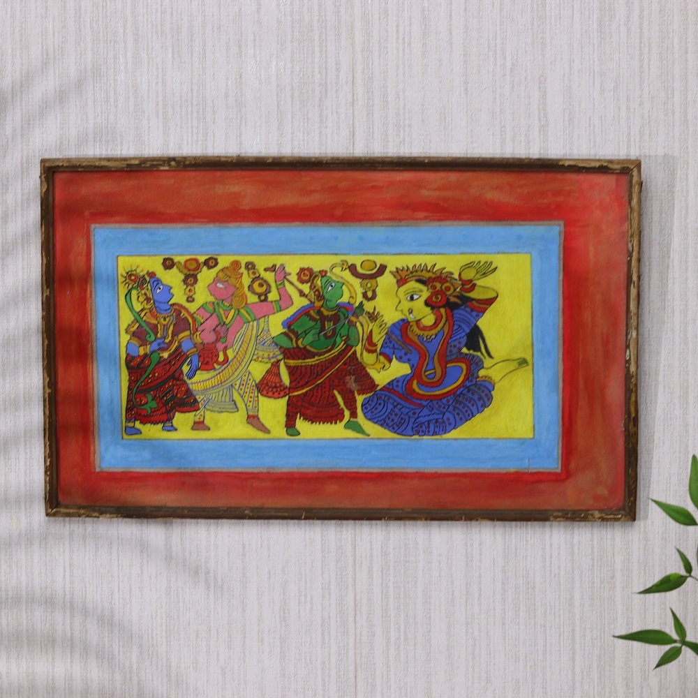 Bring the vibrant artistry of Orissa into your home with this stunning used pattachitra painting of Lord Rama. Crafted with meticulous attention to detail, this one-of-a-kind piece is a testament to the rich cultural heritage of India. This pattachitra painting is a masterful fusion of spirituality and artistic expression. The vivid colors and intricate brushwork transport you to the spiritual heart of Orissa, where the divine figure of Rama is revered with deep reverence. Every element of the composition holds profound meaning, inviting you to immerse yourself in the captivating world of Hindu mythology. Whether you're an avid collector of Indian art or simply seeking to infuse your living space with cultural vibrancy, this pattachitra painting is a must-have. Displaying this framed artwork allows you to celebrate the beauty of Orissa's artistic legacy while elevating the aesthetic of any room. Invite the presence of Rama into your home and experience the uplifting energy that radiates from this singular piece of cultural heritage.