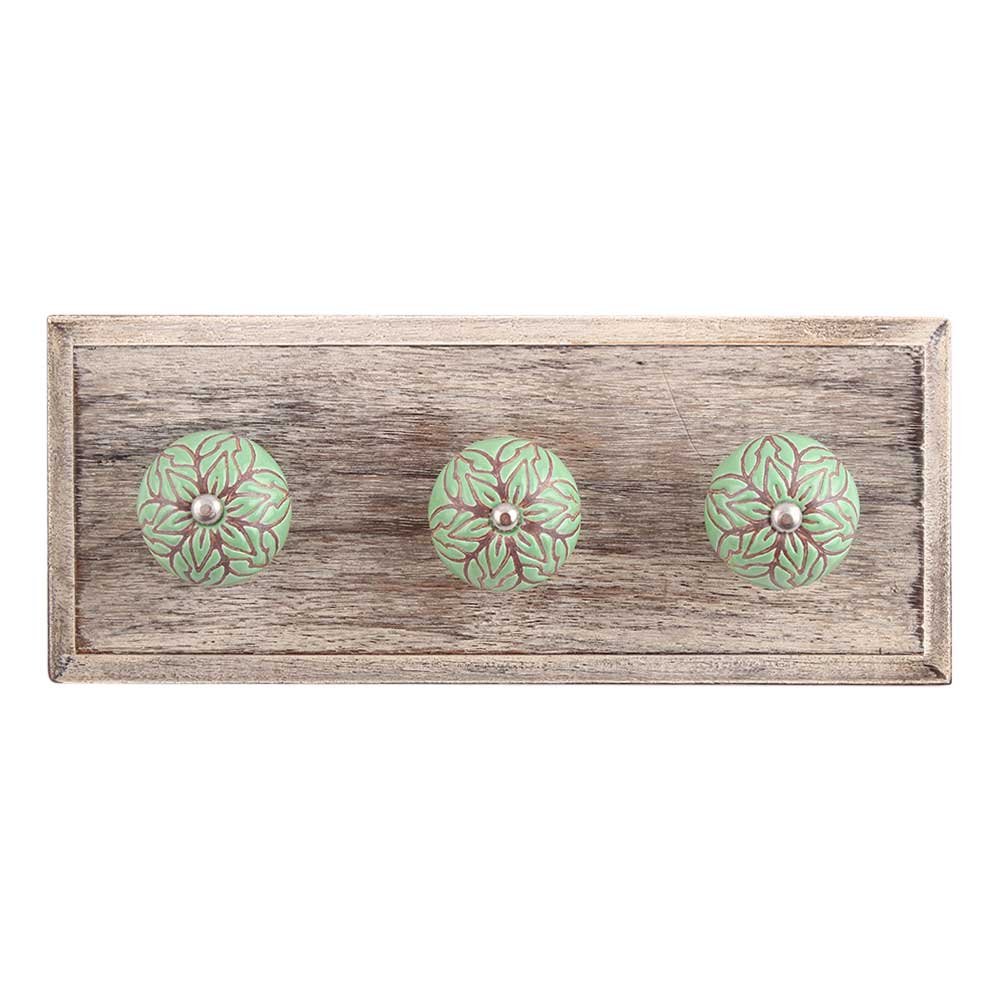Pea Green Amarylis Etched Ceramic Wooden Hook. A Perfect Complement to the Soft Tone of the Wood are these White Traditional Hat Coat Hook Made of Genuine Porcelain and Brass. It can be use to Hang Jewellery, Leashes, Towels, Scarves, Light Weight Sweaters, Caps Etc.