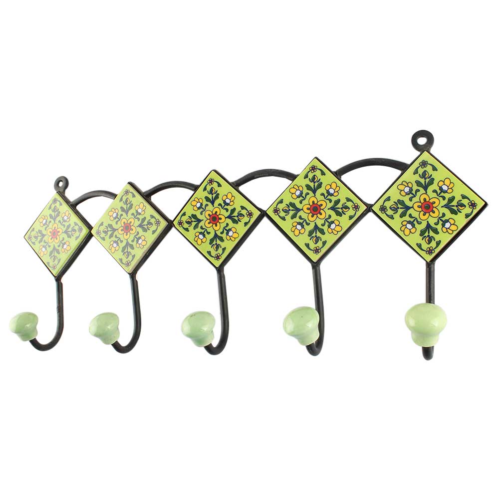 Pea Green Big Ceramic Floral Tile Wall Hook. When Put on Wall or Cabinet It is An Art in Itself. The Metal Part of this Hook is Black Powder Coated.