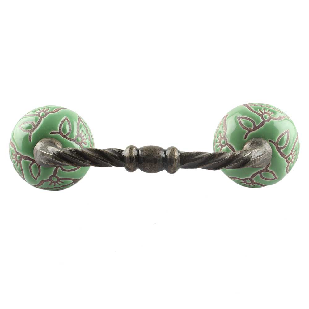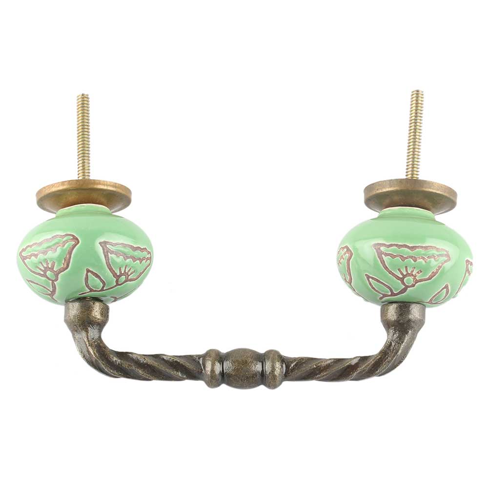 Pea Green Calla Lily Brown Etched Ceramic Cut Bridge Handle. Ideal for Drawer, Dresser, Cabinet, Wardrobe, Cupboard and Almirah etc.