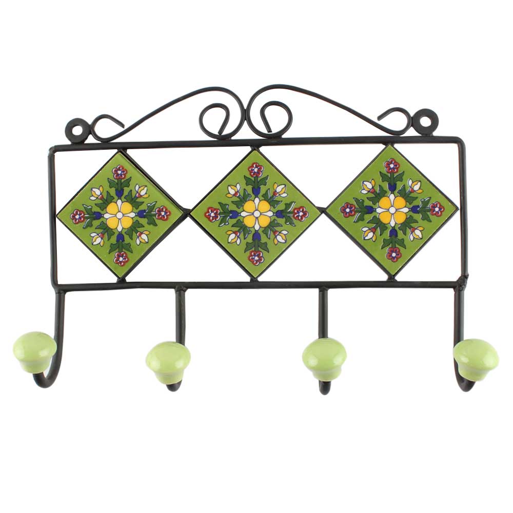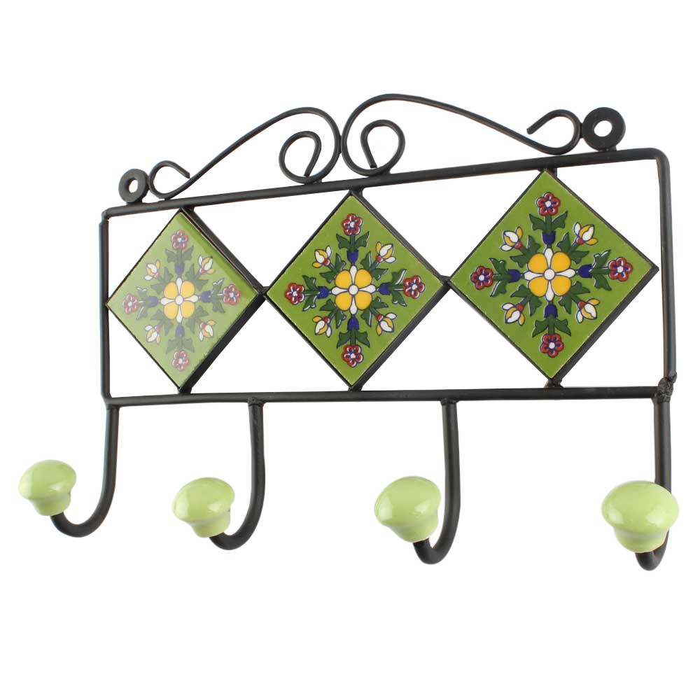 Pea Green Ceramic Floral Tile Hook. When Put on Wall or Cabinet It is An Art in Itself. The Metal Part of this Hook is Black Powder Coated.