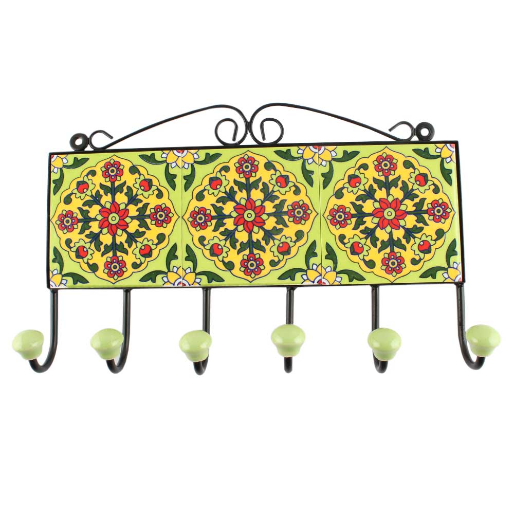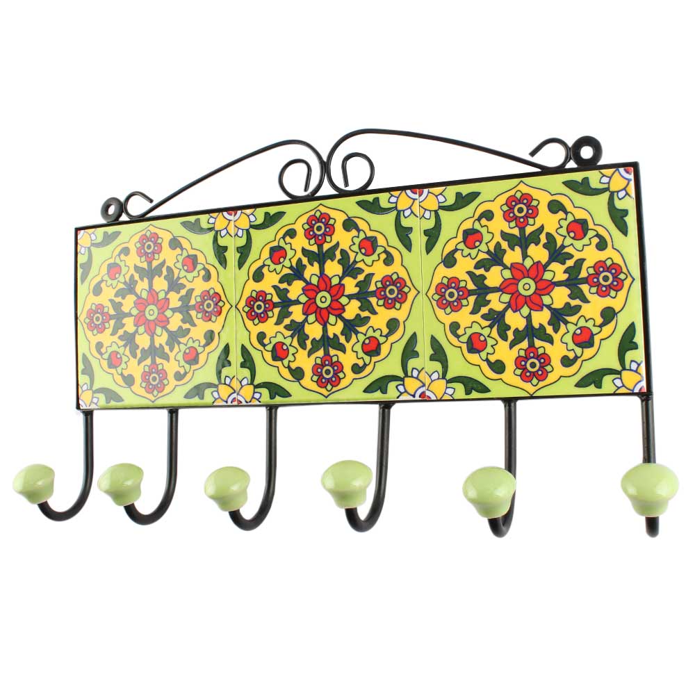 Pea Green Ceramic Flower Tile Hook. When Put on Wall or Cabinet It is An Art in Itself. The Metal Part of this Hook is Black Powder Coated.