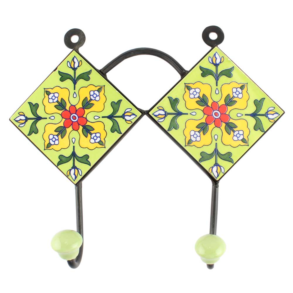 Pea Green Floral Ceramic Tile Hook. When Put on Wall or Cabinet It is An Art in Itself. The Metal Part of this Hook is Black Powder Coated.