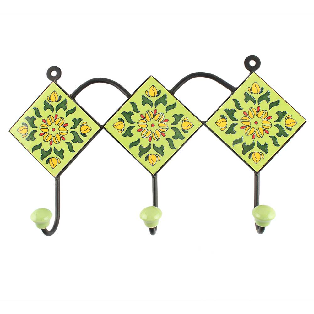Pea Green Floral Ceramic Tile Hook. When Put on Wall or Cabinet It is An Art in Itself. The Metal Part of this Hook is Black Powder Coated.
