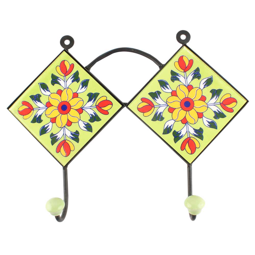 Pea Green Flower Ceramic Tile Wall Hook Online. When Put on Wall or Cabinet It is An Art in Itself. The Metal Part of this Hook is Black Powder Coated.