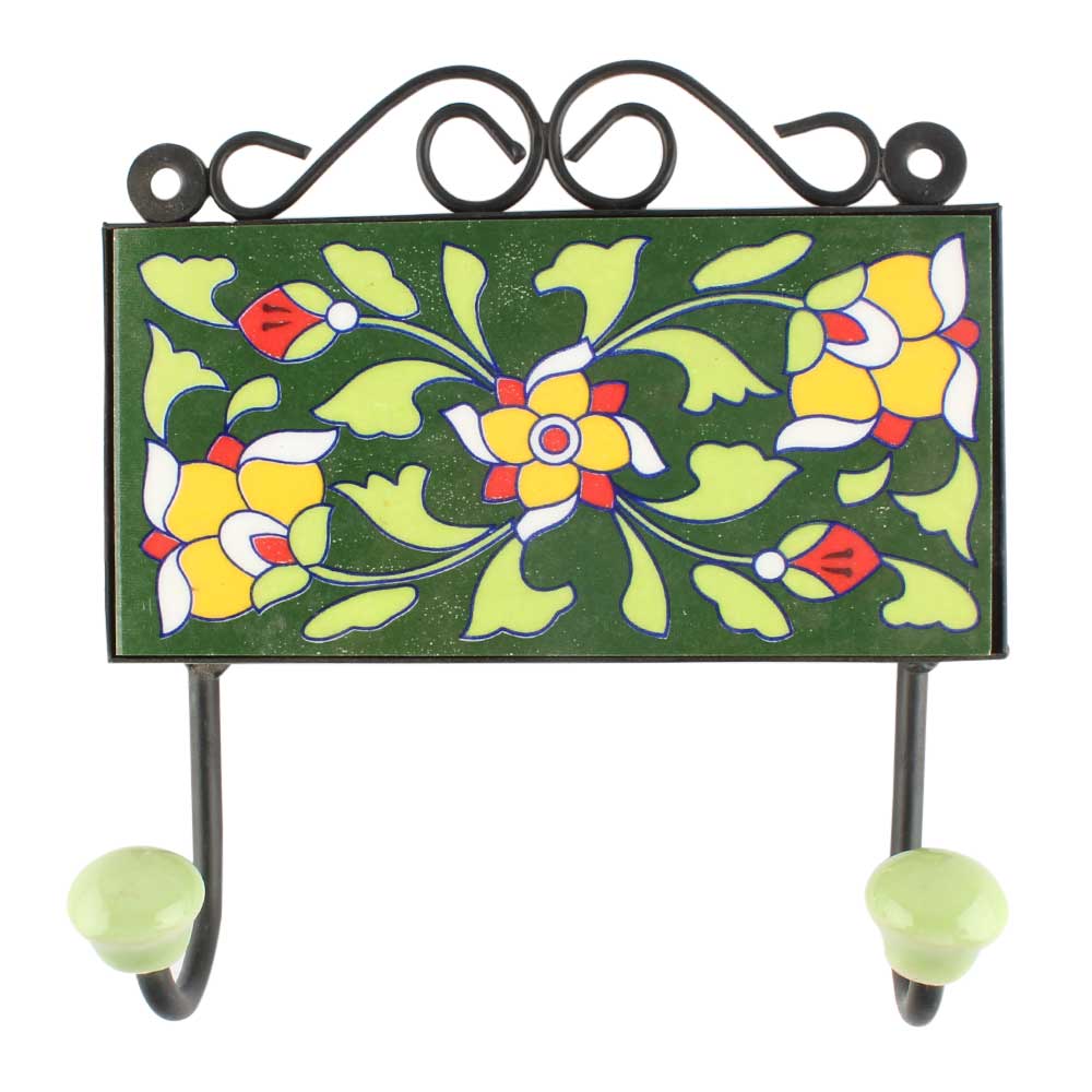 Pea Green Leaf Floral Ceramic Tile Hook. When Put on Wall or Cabinet It is An Art in Itself. The Metal Part of this Hook is Black Powder Coated.