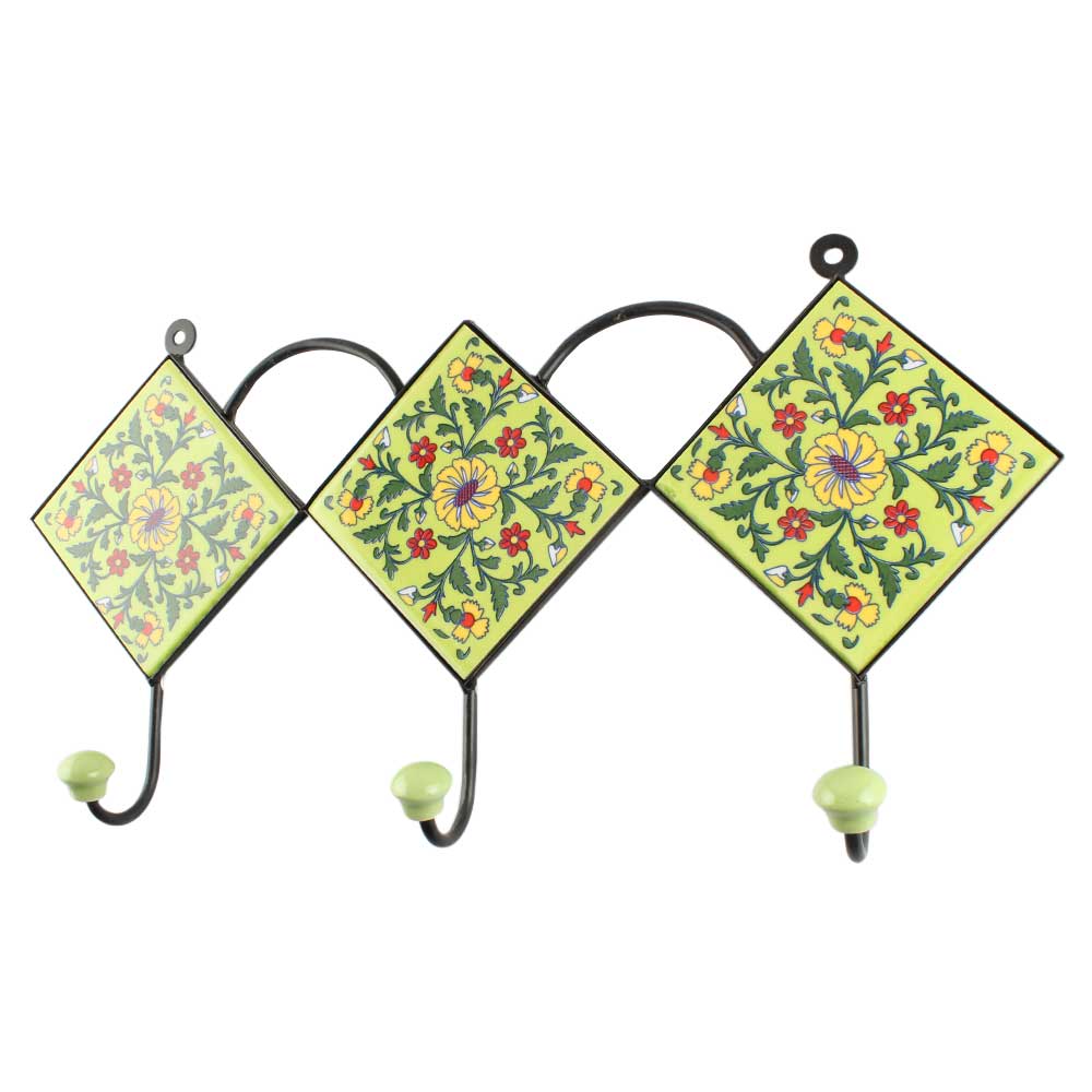 Pea Green Leaf Flower Ceramic Tile Hook. When Put on Wall or Cabinet It is An Art in Itself. The Metal Part of this Hook is Black Powder Coated.