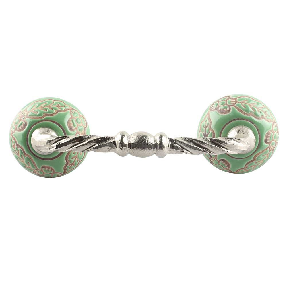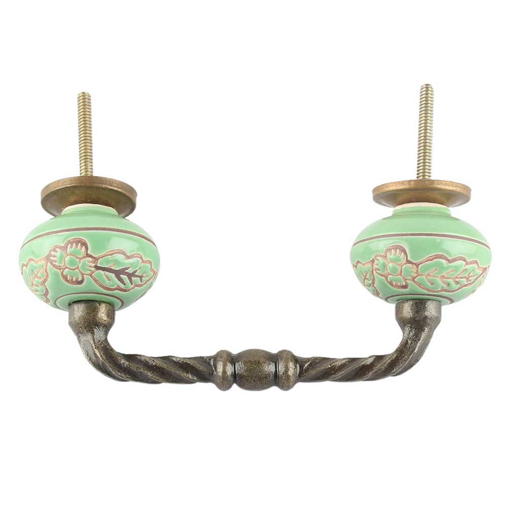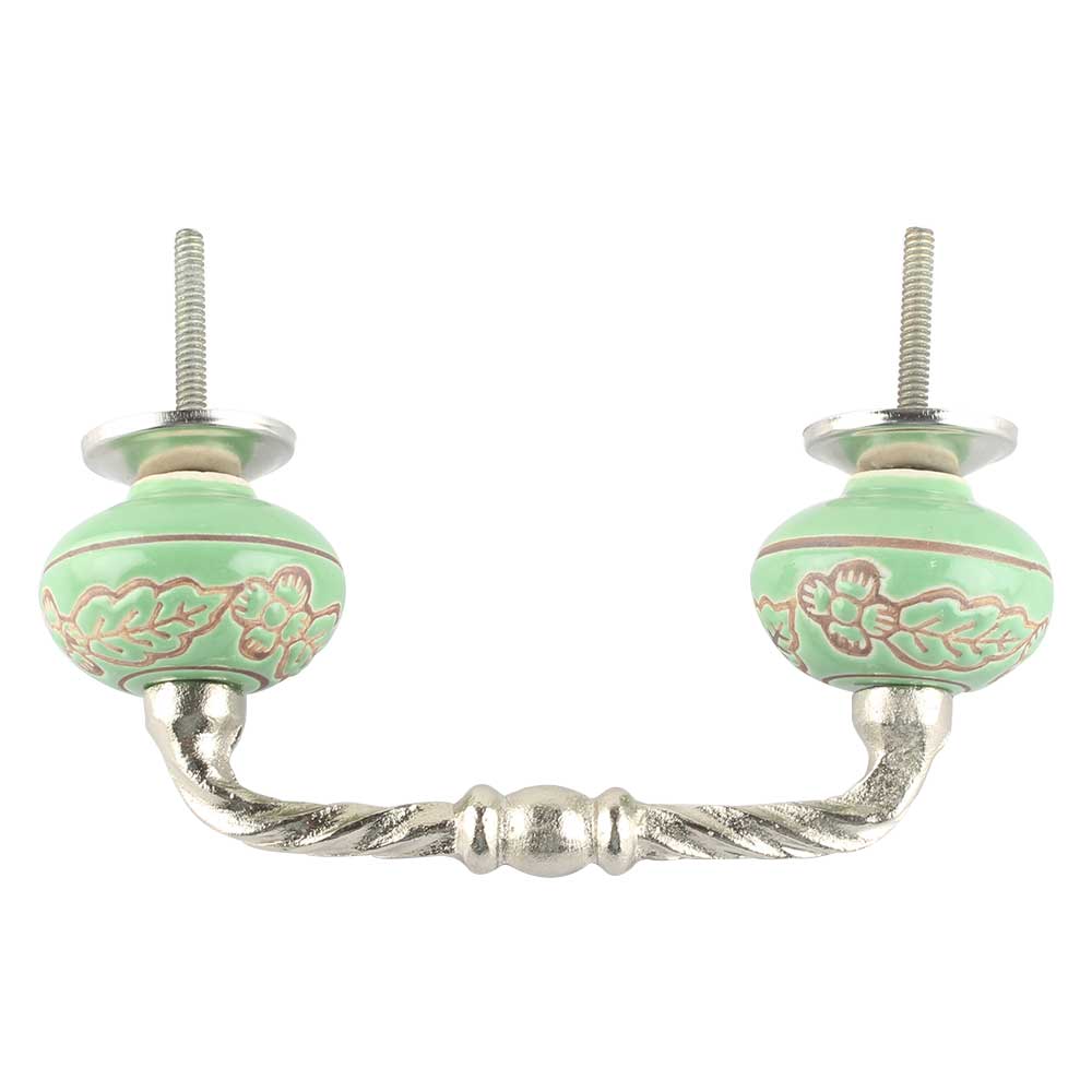 Pea Green Leaf Flower Etched Ceramic Cut Bridge Handle. Ideal for Drawer, Dresser, Cabinet, Wardrobe, Cupboard and Almirah etc.