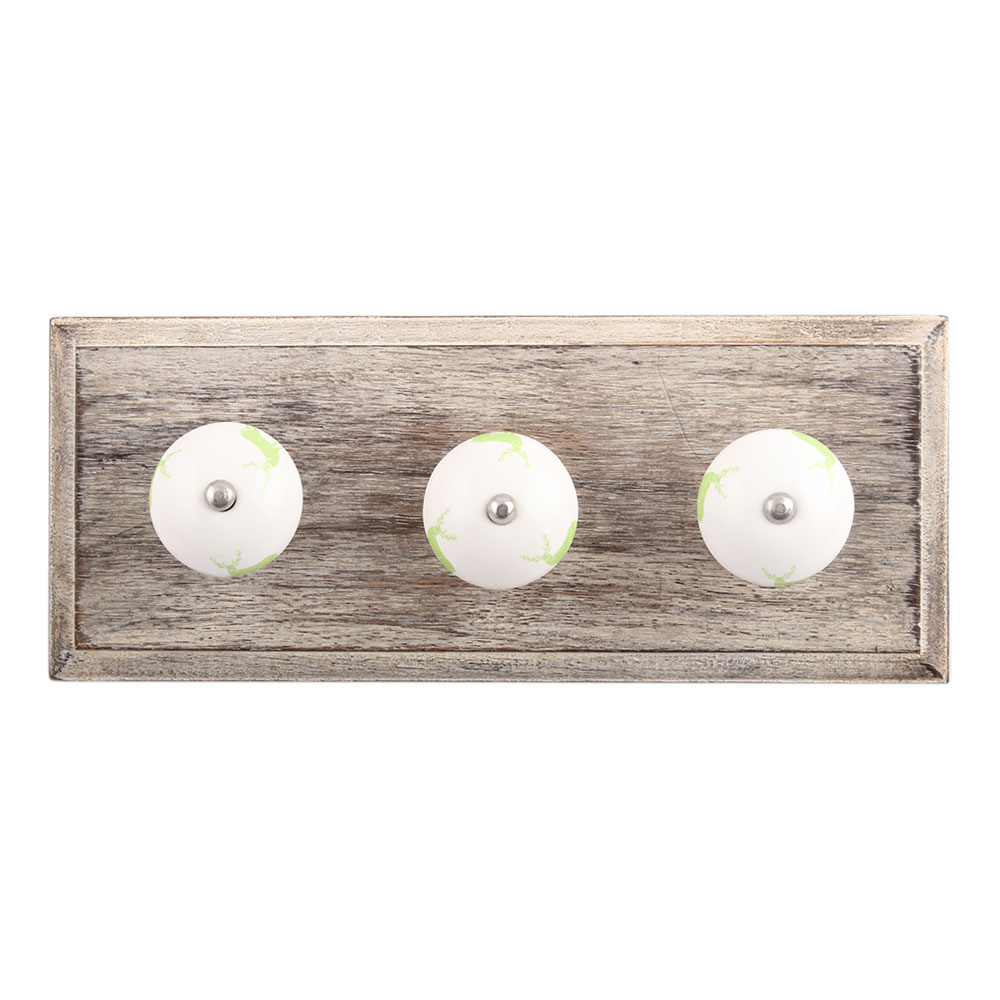 Pea Green Standing Rein Deer Pattern Ceramic Wooden Hook. A Perfect Complement to the Soft Tone of the Wood are these White Traditional Hat & Coat Hook Made of Genuine Porcelain and Brass. It can be use to Hang Jewellery, Leashes, Towels, Scarves, Light Weight Sweaters, Caps Etc.