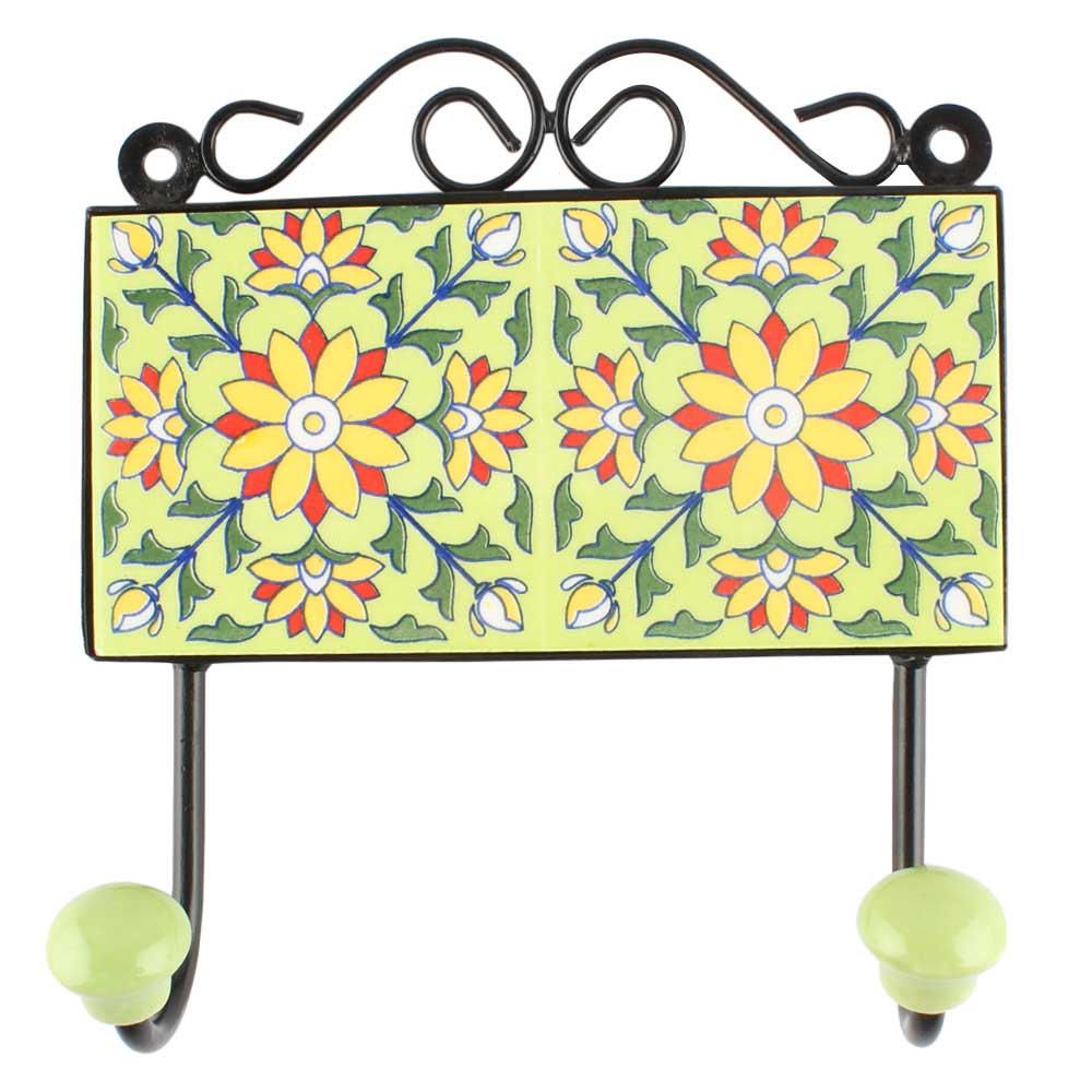 Pea Green Sunflower Ceramic Tile Wall Hook. When Put on Wall or Cabinet It is An Art in Itself. The Metal Part of this Hook is Black Powder Coated.