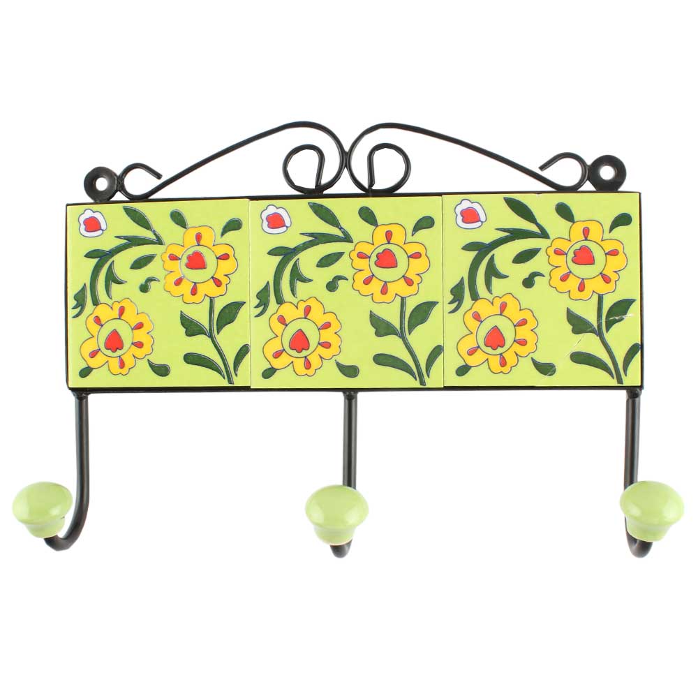 Pea Green Tiny Flower Ceramic Tile Wall Hook. When Put on Wall or Cabinet It is An Art in Itself. The Metal Part of this Hook is Black Powder Coated.