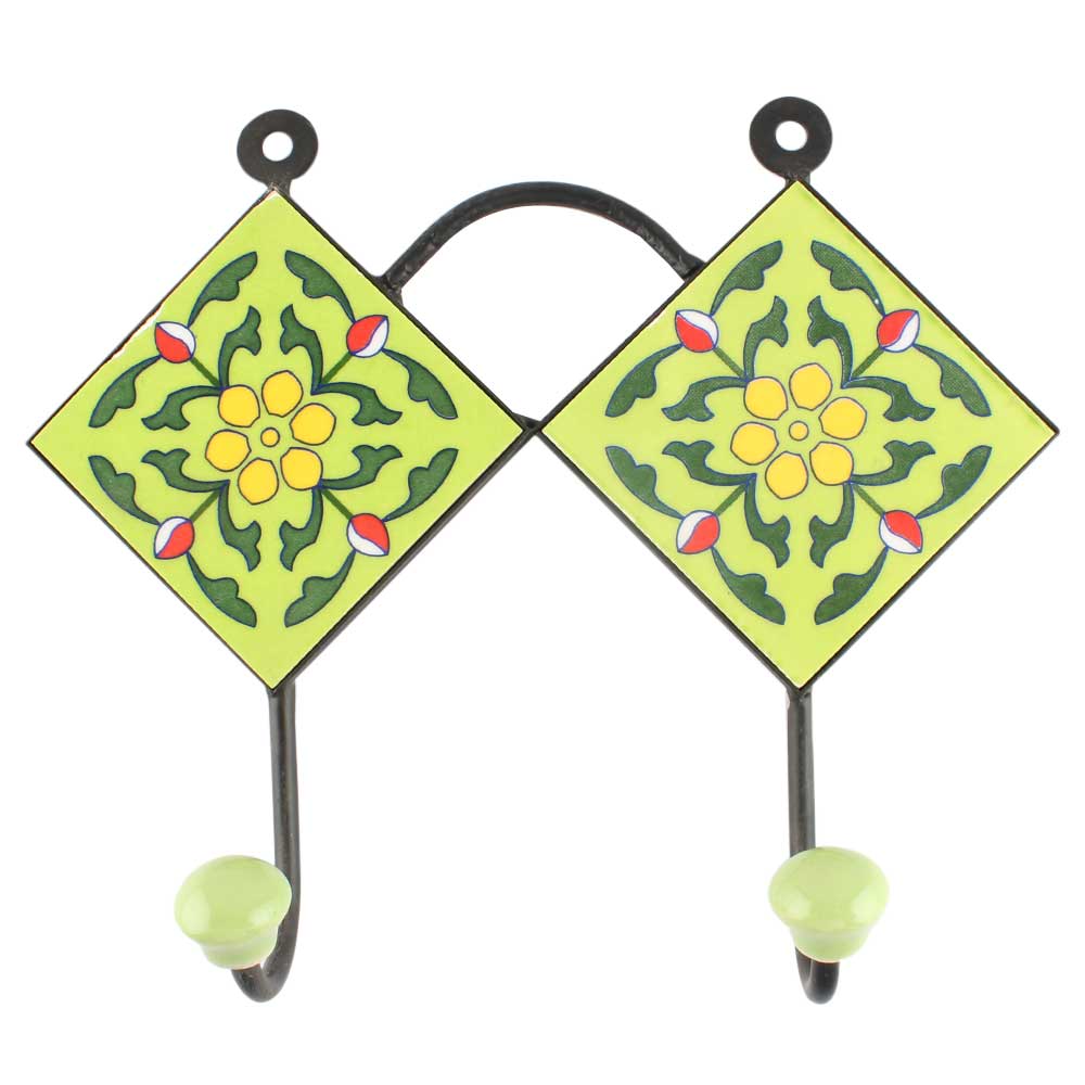 Pea Green Tiny Flower Ceramic Tile Wall Hook. When Put on Wall or Cabinet It is An Art in Itself. The Metal Part of this Hook is Black Powder Coated.