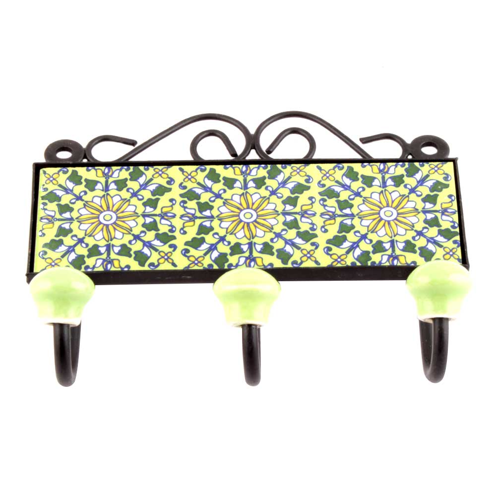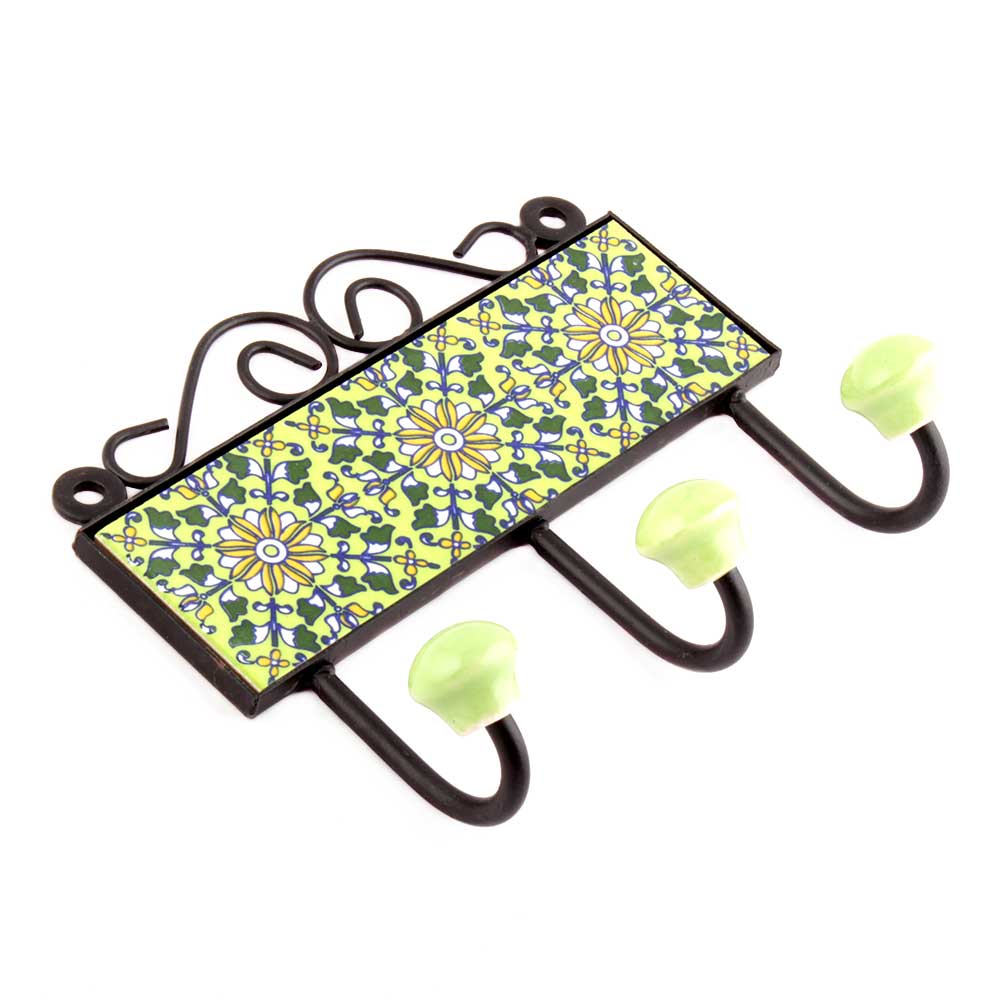 Pea Green Yellow Sunflower Tiles Hooks. When Put on Wall or Cabinet it is an Art in itself. The Metal Part of this Hook is Black Powder Coated.