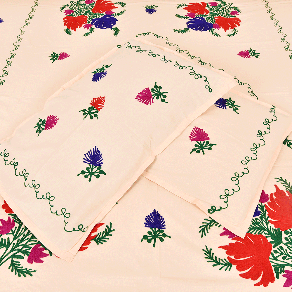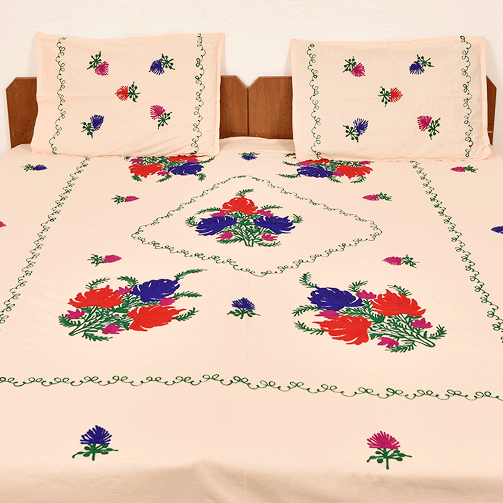 Peach Cotton Bedspread Decorative Big Floral Motifs With Two Pillow Covers.