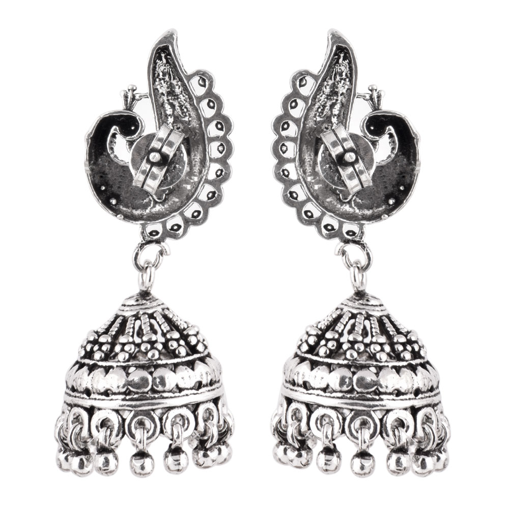 These 925 Sterling silver jhumkis can be worn at all auspicious function wedding, engagements or during the festival time. It can also be worn on regular basis. It has a lovely peacock motif top and embellished with metallic beads. An ideal present for your mother, sister or wife.