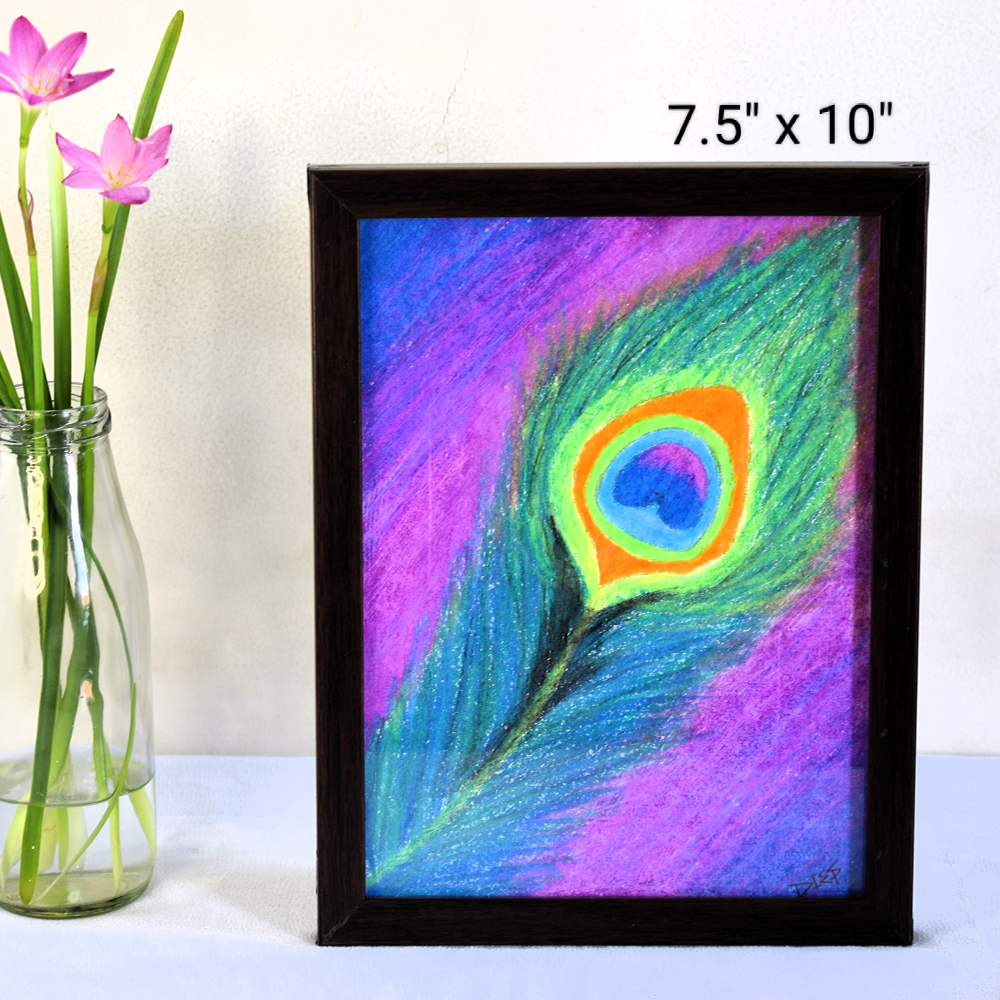 A radiant and abstract interpretation of a peacock feather, created using oil pastels on paper. This expressive artwork features bold strokes and rich textures in vibrant shades of blue, green, orange, and violet, symbolizing grace, beauty, and vibrancy. The feather's eye-like center stands out with mesmerizing depth against a luminous background, making it a perfect piece for adding color and elegance to any space.