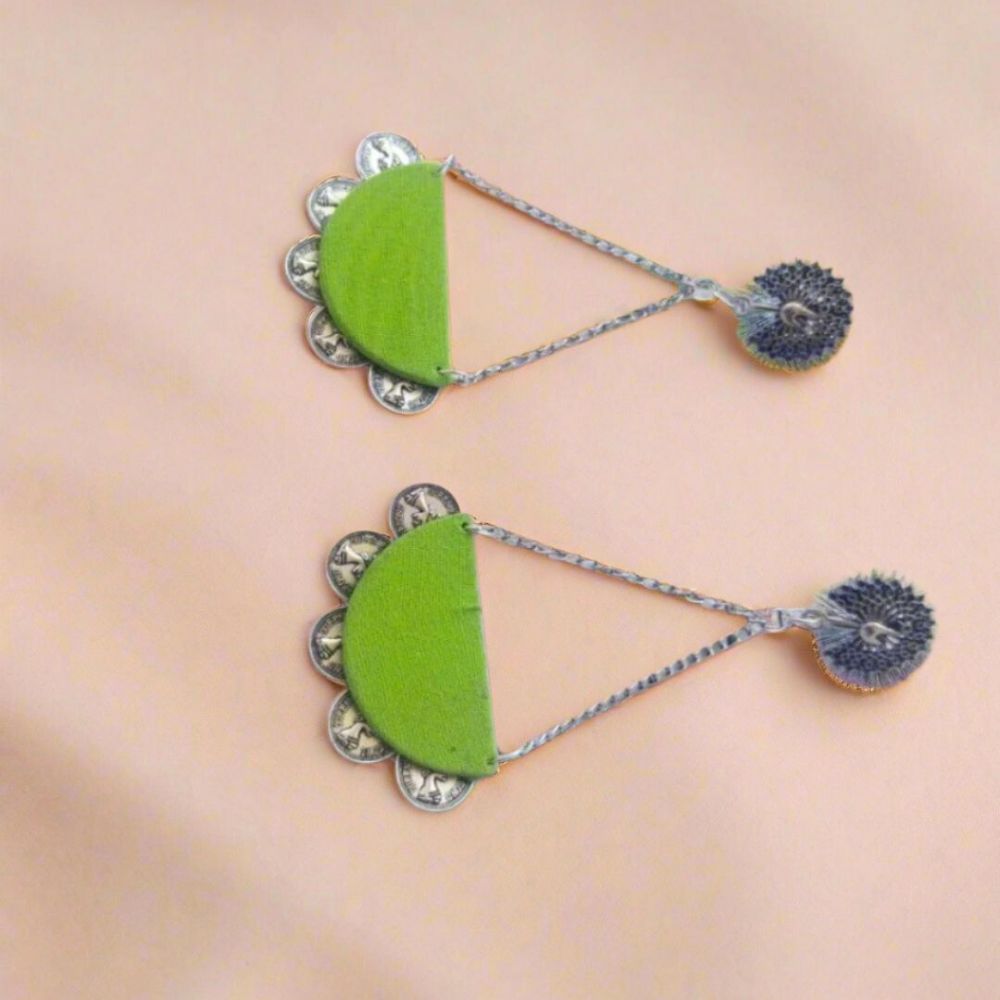 The Peacock Green and Silver Chain Long Earrings capture the richness of jewel-toned color paired with elegant motion. Crafted on a fabric base, the peacock green shade reflects depth, vibrancy, and traditional Indian aesthetics. Silver-toned chain detailing adds a fluid, elongated drop that moves gently with every step. Designed to feel lightweight yet expressive, these earrings bring refined drama to both festive and everyday styling.