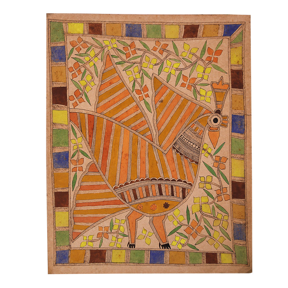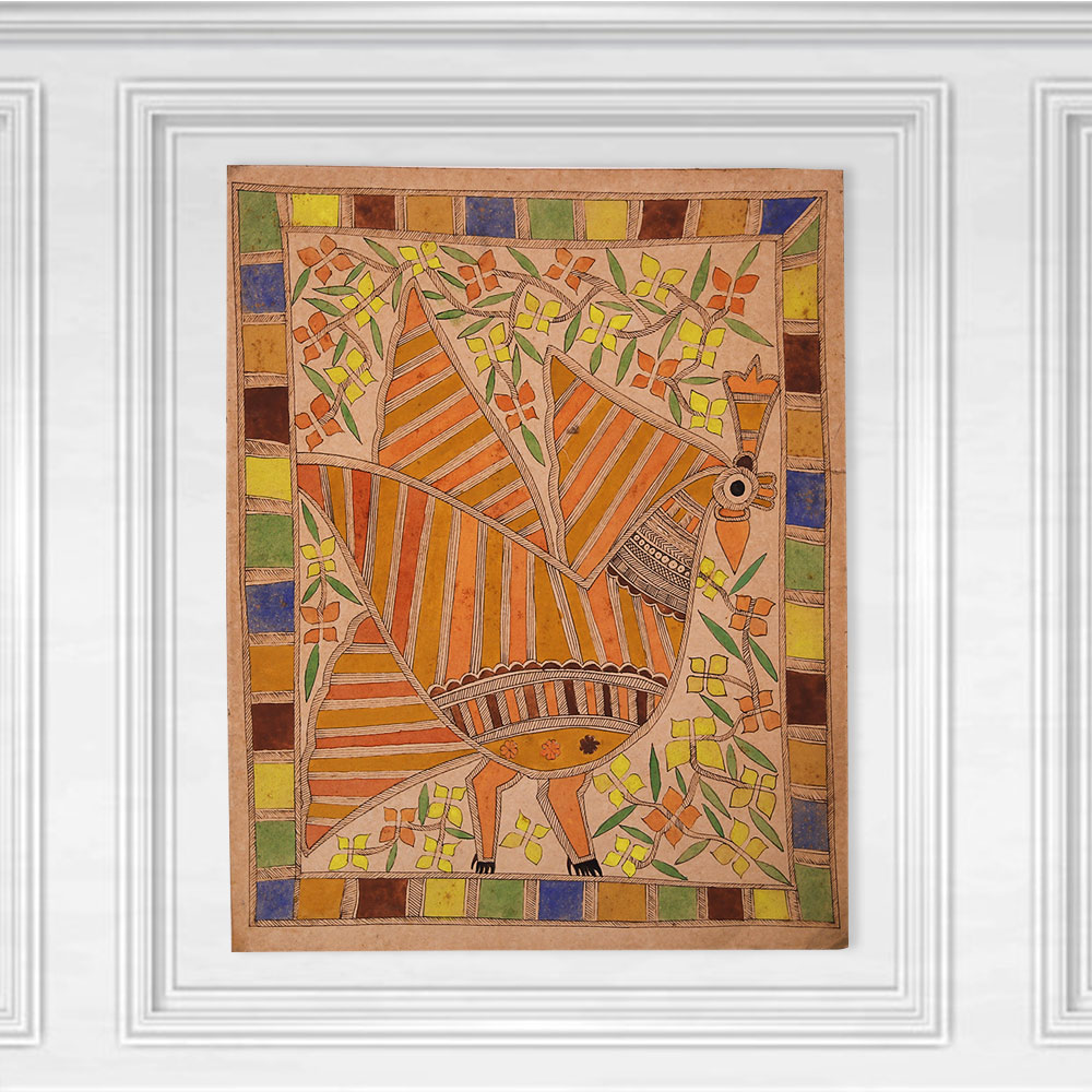 Discover the enchanting world of traditional Madhubani art with this exquisite paper painting of a peacock, created by a skilled artist. Bursting with vibrant colors and intricate patterns, this captivating work of art celebrates the rich cultural heritage of India and the majestic beauty of the peacock. Elevate your living space with the captivating presence of this Madhubani peacock painting. More than just a decorative piece, this artwork is a testament to the enduring artistic traditions of the Mithila region, where generations of skilled artists have honed their craft. Whether you're an art enthusiast, a lover of Indian heritage, or simply seeking to add a stunning focal point to your decor, this Madhubani peacock painting is a must-have. Immerse yourself in the vibrant colors and intricate details, and let this captivating masterpiece transport you to a world of beauty and cultural richness.