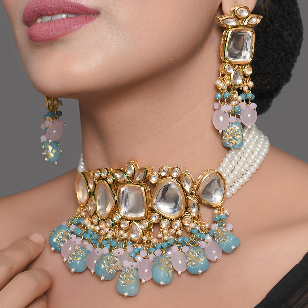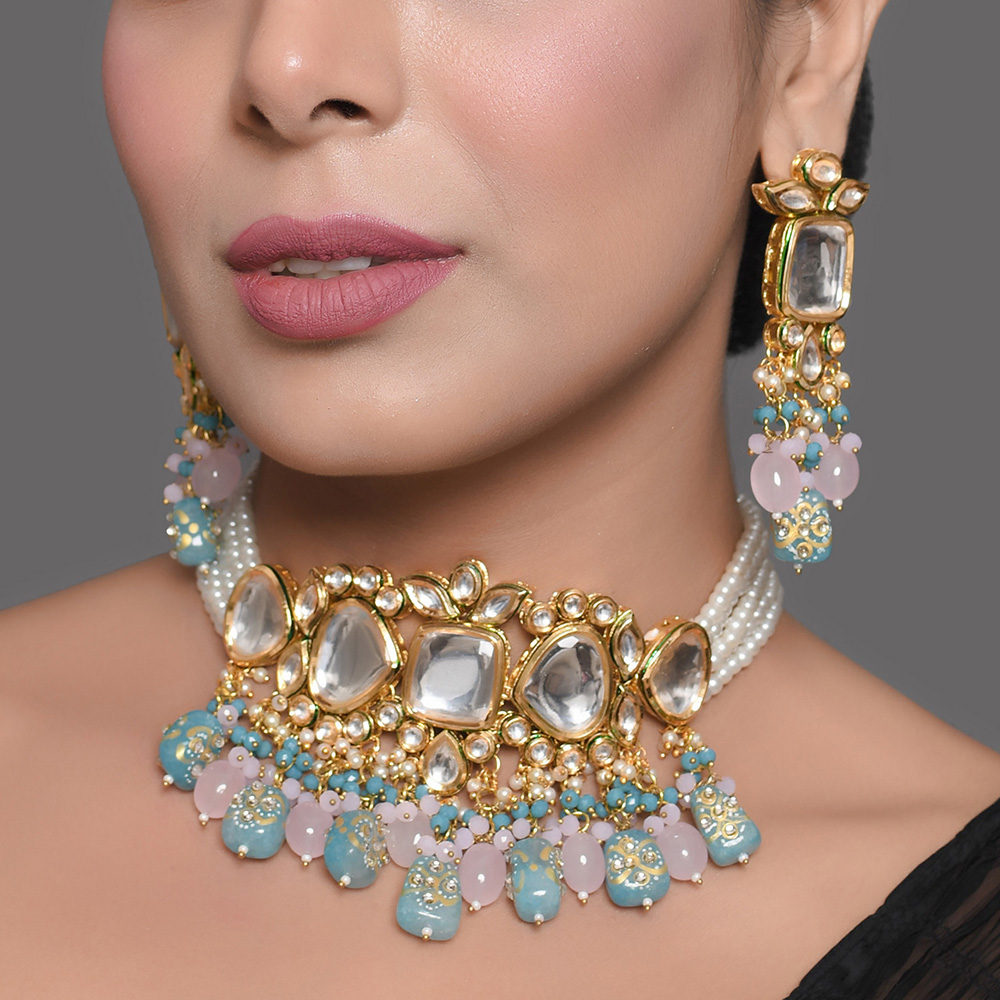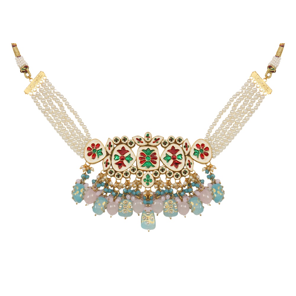 Luxurious and expressive, this pearl beaded statement necklace set is designed to create a refined yet striking presence. Featuring a bold central arrangement of mirror-style stones framed with intricate detailing, the necklace is complemented by cascading pastel bead drops and matching drop earrings, making it ideal for special occasions. Statement Necklace Set Highlights Handcrafted by skilled artisans, this jewellery set blends traditional inspiration with contemporary colour play and balanced symmetry. Statement necklace with mirror-style stones in mixed geometric shapes Multiple strands of fine pearl beads forming the side chains Cascading pastel bead drops for elegant movement Matching handcrafted drop earrings included Designed for weddings, receptions, and festive celebrations Specs & Materials Material: Metal alloy with mirror-style stones, pearl beads, and pastel glass beads Colour: Warm gold tone with white pearls and soft blue-pink accents Design: Structured statement necklace with coordinated earrings Origin: Handmade in India and individually quality-checked Each piece shows slight variation due to handcrafted workmanship Necklace features adjustable tie-back for secure fitting Styling & Gift Inspiration Perfect for bridal wear, wedding functions, and evening events Pairs beautifully with lehengas, sarees, and embroidered outfits An elegant gift choice for weddings, anniversaries, and festive occasions Adds a luxurious focal point without overpowering the attire Care Guide Store the set in a dry pouch and avoid contact with water, perfume, or harsh chemicals. Wipe gently with a soft cloth after use to maintain shine and detailing. Artisan Craftsmanship This jewellery set is entirely handcrafted using traditional techniques. All pieces are handmade never machine-made ensuring individuality and artisanal character.