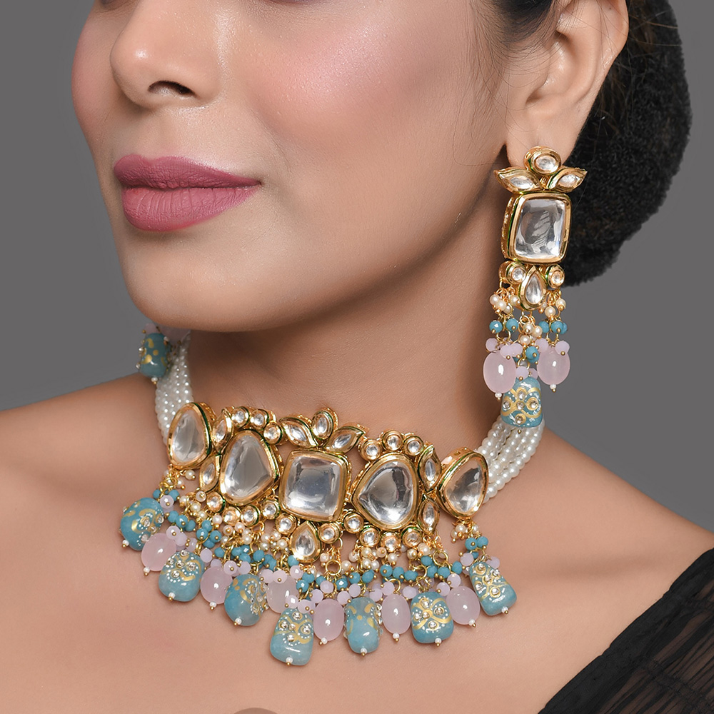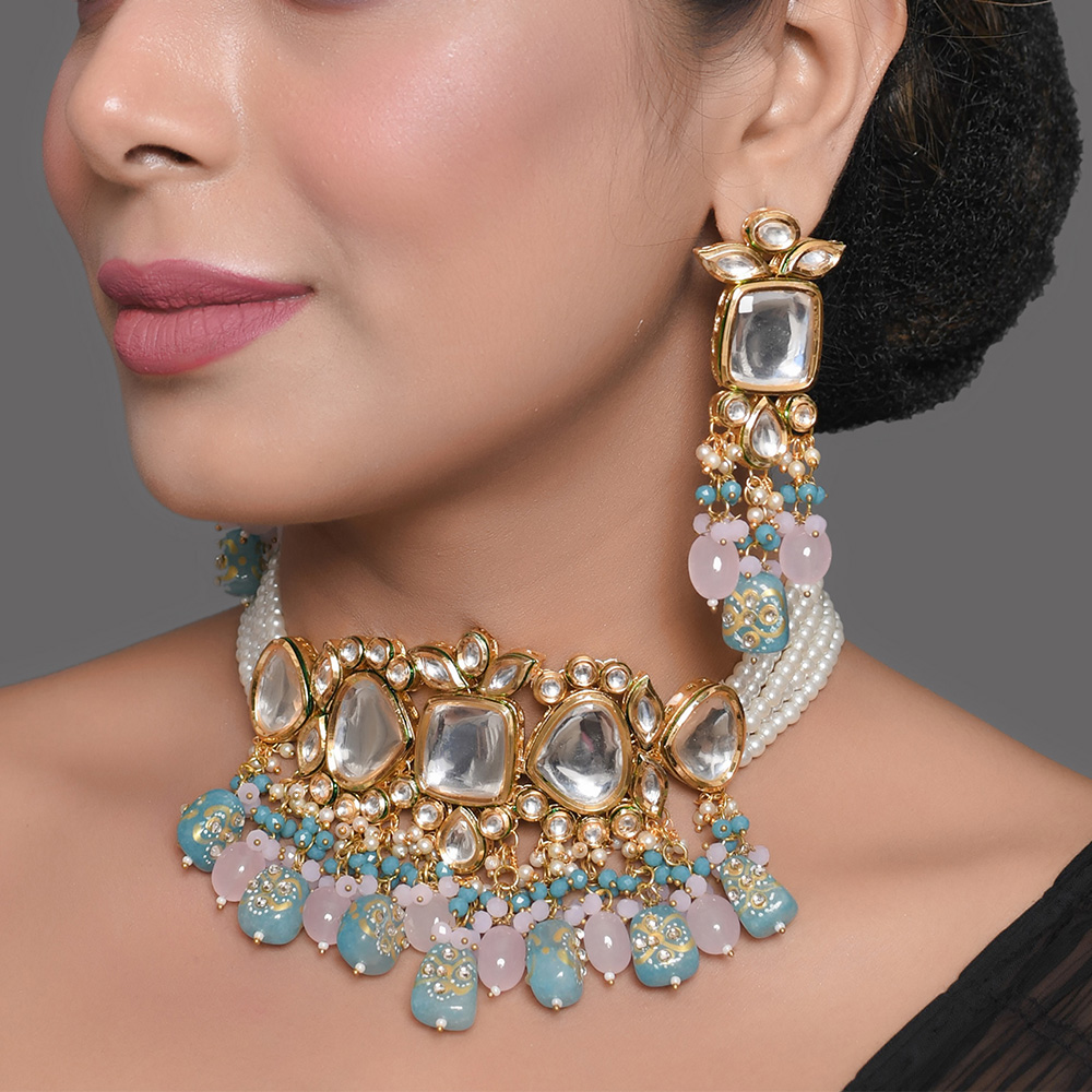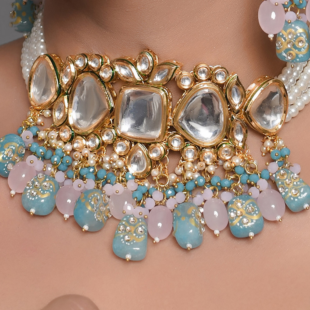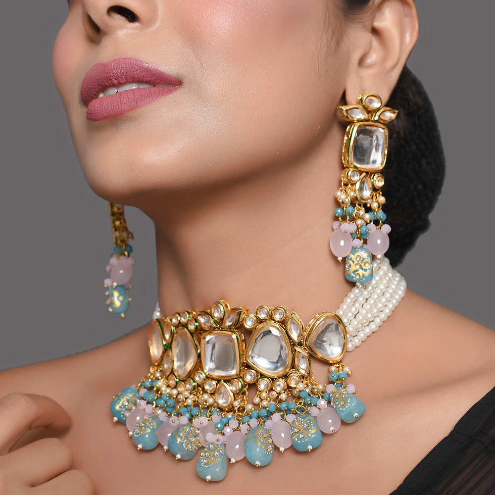 Luxurious and expressive, this pearl beaded statement necklace set is designed to create a refined yet striking presence. Featuring a bold central arrangement of mirror-style stones framed with intricate detailing, the necklace is complemented by cascading pastel bead drops and matching drop earrings, making it ideal for special occasions. Statement Necklace Set Highlights Handcrafted by skilled artisans, this jewellery set blends traditional inspiration with contemporary colour play and balanced symmetry. Statement necklace with mirror-style stones in mixed geometric shapes Multiple strands of fine pearl beads forming the side chains Cascading pastel bead drops for elegant movement Matching handcrafted drop earrings included Designed for weddings, receptions, and festive celebrations Specs & Materials Material: Metal alloy with mirror-style stones, pearl beads, and pastel glass beads Colour: Warm gold tone with white pearls and soft blue-pink accents Design: Structured statement necklace with coordinated earrings Origin: Handmade in India and individually quality-checked Each piece shows slight variation due to handcrafted workmanship Necklace features adjustable tie-back for secure fitting Styling & Gift Inspiration Perfect for bridal wear, wedding functions, and evening events Pairs beautifully with lehengas, sarees, and embroidered outfits An elegant gift choice for weddings, anniversaries, and festive occasions Adds a luxurious focal point without overpowering the attire Care Guide Store the set in a dry pouch and avoid contact with water, perfume, or harsh chemicals. Wipe gently with a soft cloth after use to maintain shine and detailing. Artisan Craftsmanship This jewellery set is entirely handcrafted using traditional techniques. All pieces are handmade never machine-made ensuring individuality and artisanal character.