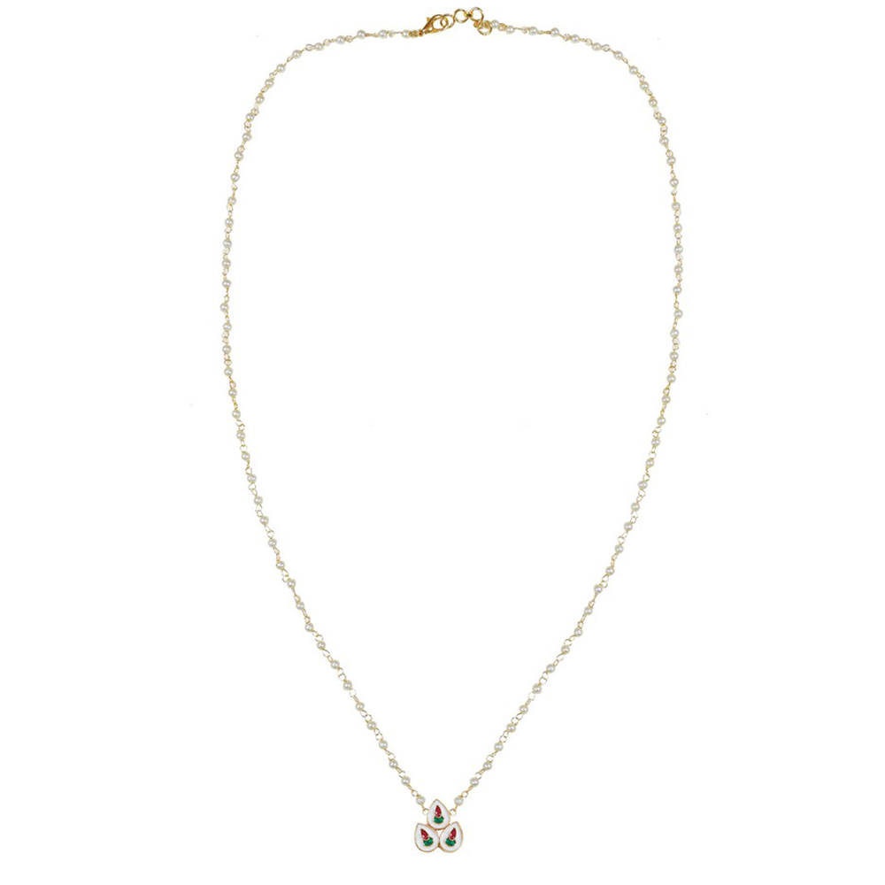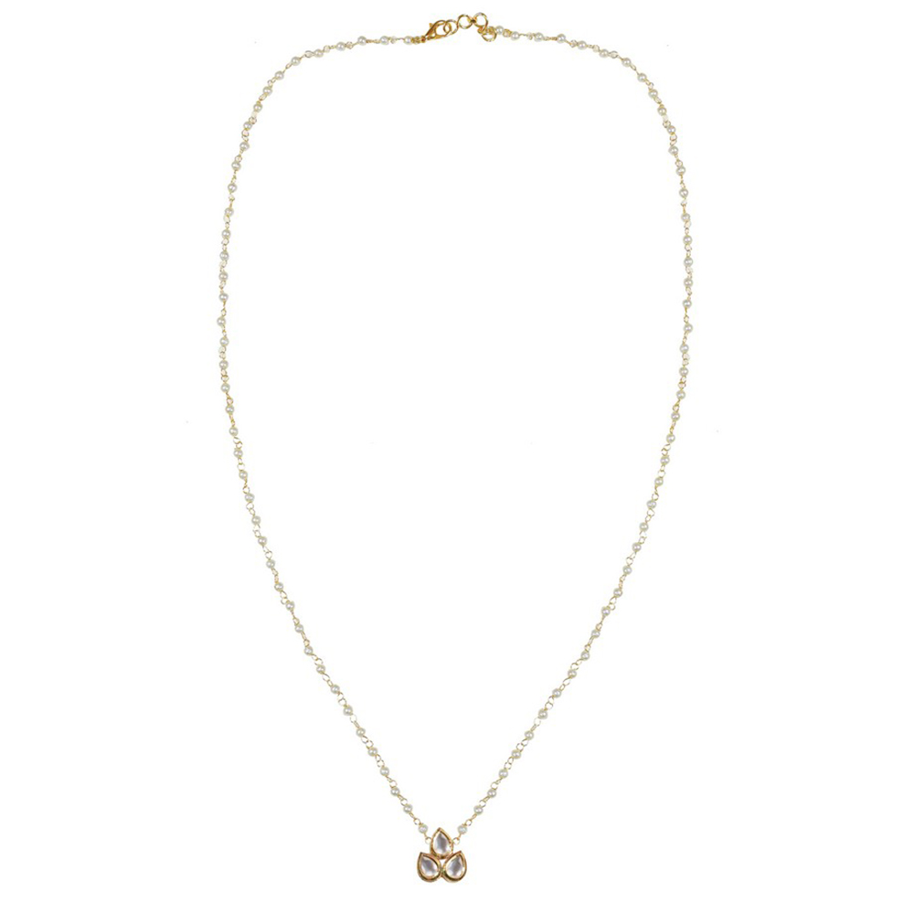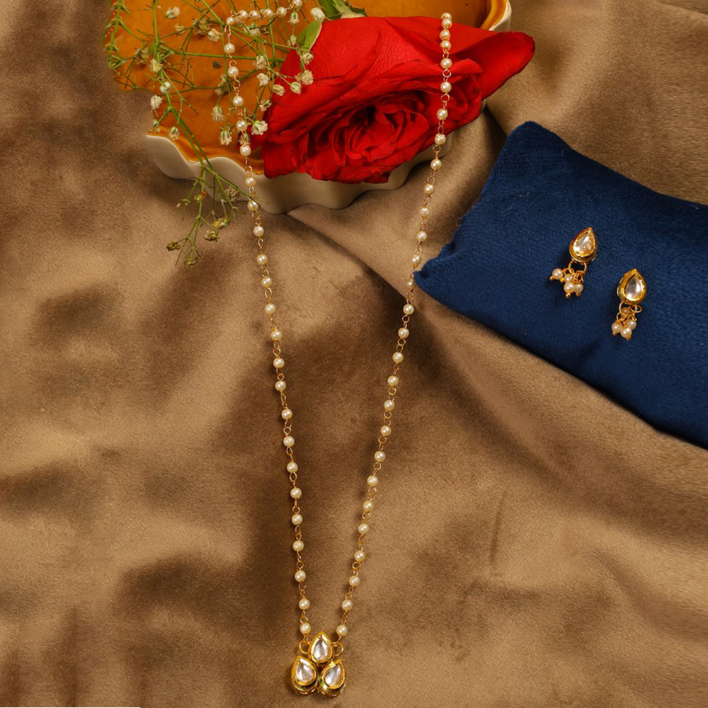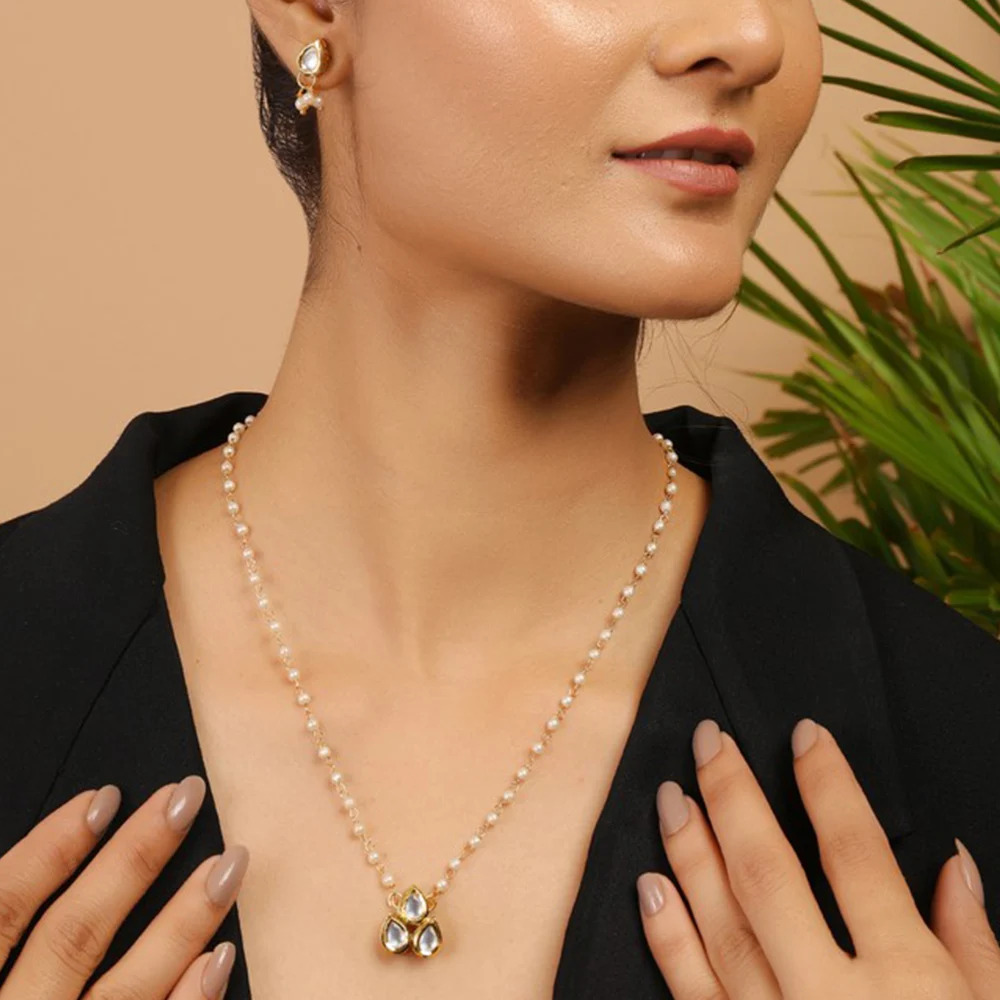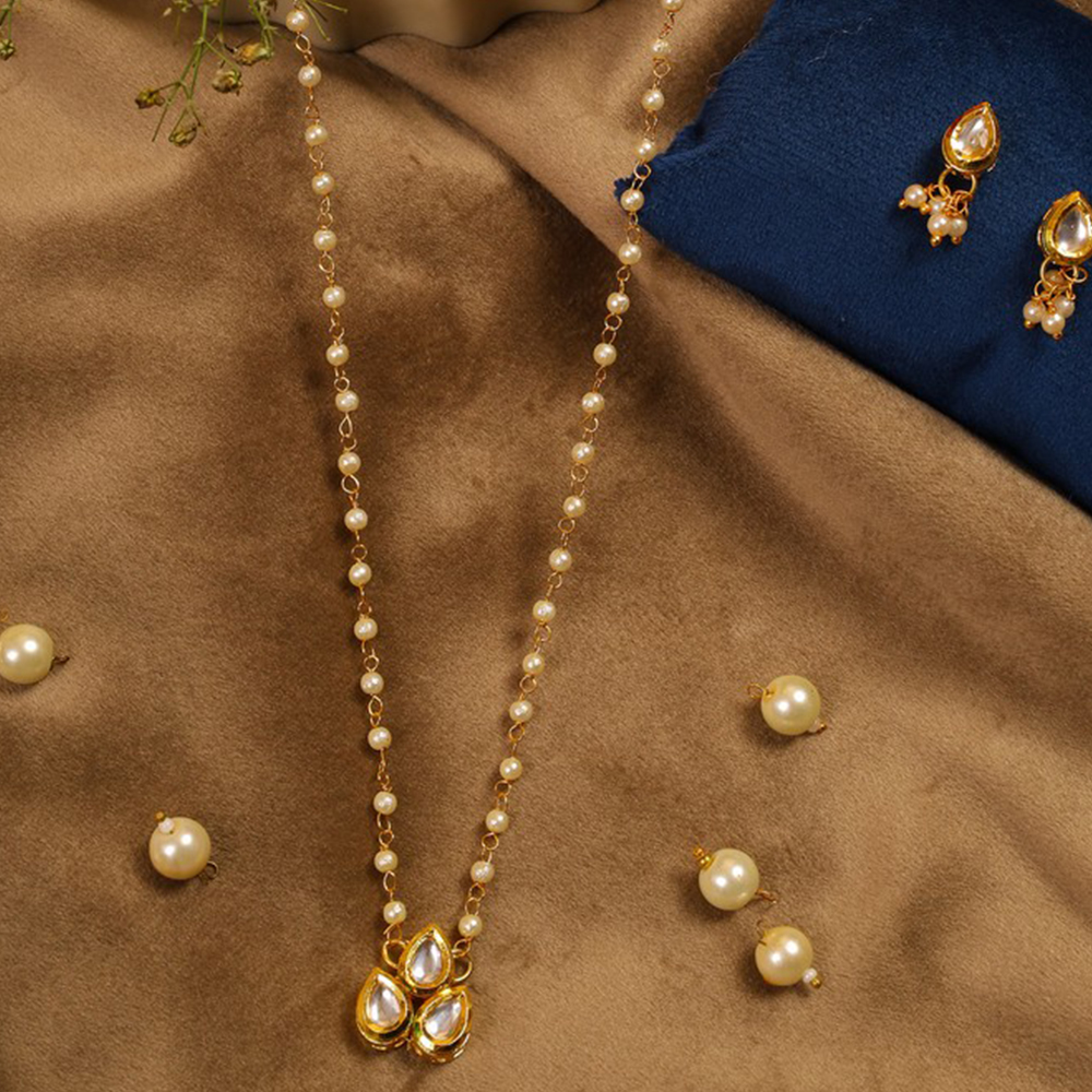 Celebrate individuality with this Pearl Chain Necklace & Earring Set with Teardrop Kundan Pendant. Featuring a delicate string of pearls, a petite pendant composed of three teardrop kundan stones set in gold tone, and matching stud earrings with pearl drops, this elegant set is perfect for weddings, parties, and meaningful gifting. Packed & quality-checked by Indianshelf.