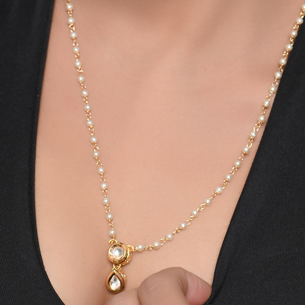 - Design: Slim pearl necklace with drop-style mirror pendant