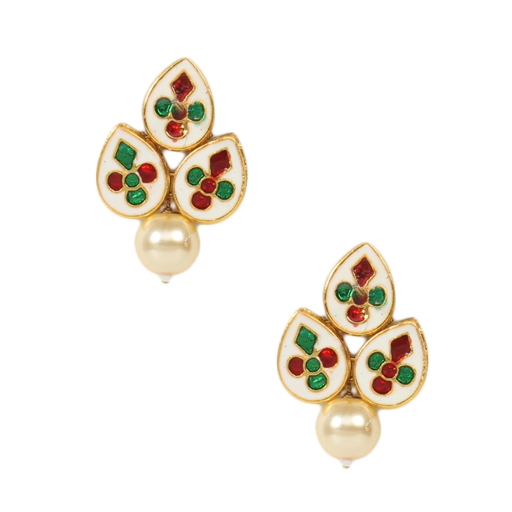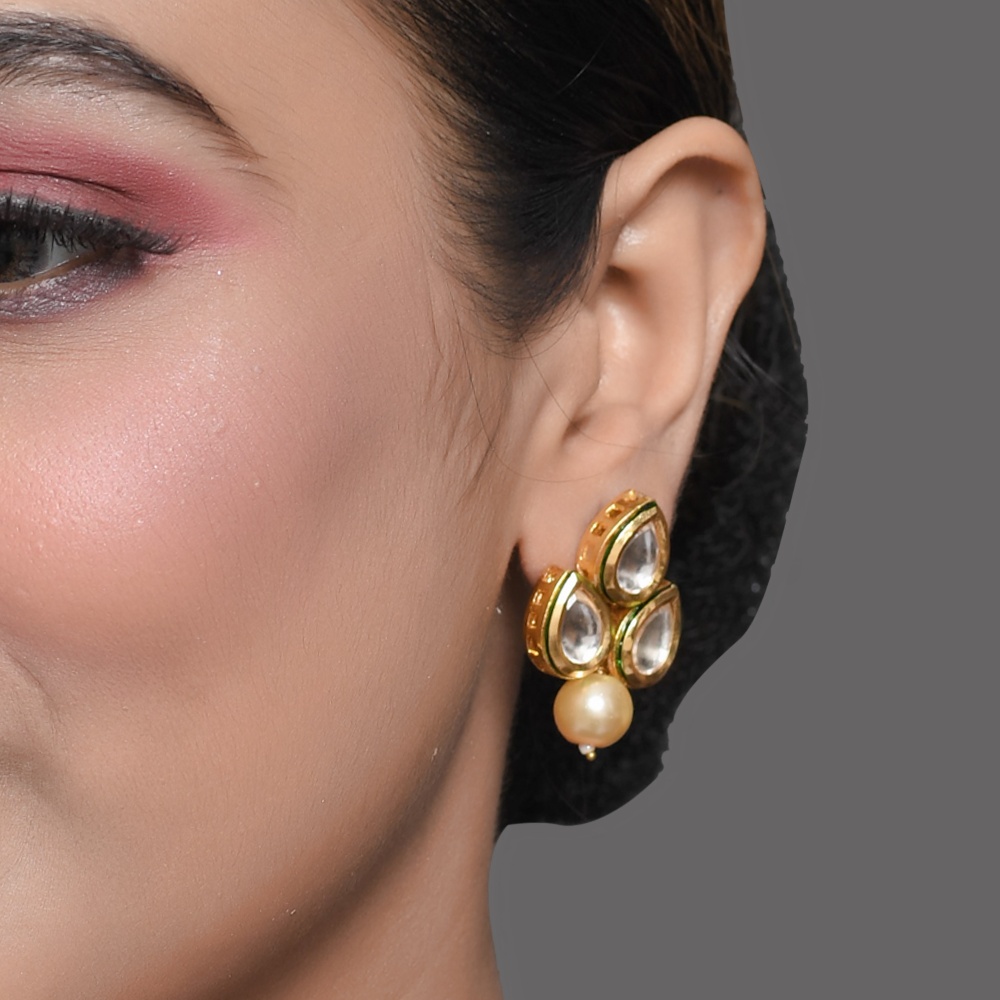 Gracefully minimal, these mirror stud earrings feature a trio of teardrop mirror-style stones arranged in a compact floral formation, finished with a single pearl drop. The balanced design brings together subtle shine and soft movement, making them ideal for refined everyday styling. Stud Earring Highlights Carefully handcrafted, these earrings showcase clean symmetry with classic detailing. Triple teardrop mirror-style stone arrangement Single pearl drop for gentle movement Compact stud profile with elegant proportions Polished gold-tone finish with reflective detailing Handcrafted using traditional jewellery techniques Specs & Materials Material: Metal alloy with mirror-style stones and pearl Colour: Gold tone with clear mirror stones and ivory pearl Design: Stud earrings with subtle drop element Origin: Handmade in India and individually quality-checked Minor variations may occur due to handcrafted nature Styling & Gifting Suitable for daily wear, festive looks, and elegant occasions Complements pearl necklaces and minimal outfits A thoughtful gift for weddings, birthdays, and celebrations Adds understated elegance without overpowering the look Care Guide Store in a dry pouch. Avoid contact with water, perfume, or chemicals. Wipe gently with a soft cloth after use. Artisan Craftsmanship Each piece is handcrafted using time-honoured methods. No machines are used, ensuring individuality and artisanal character.