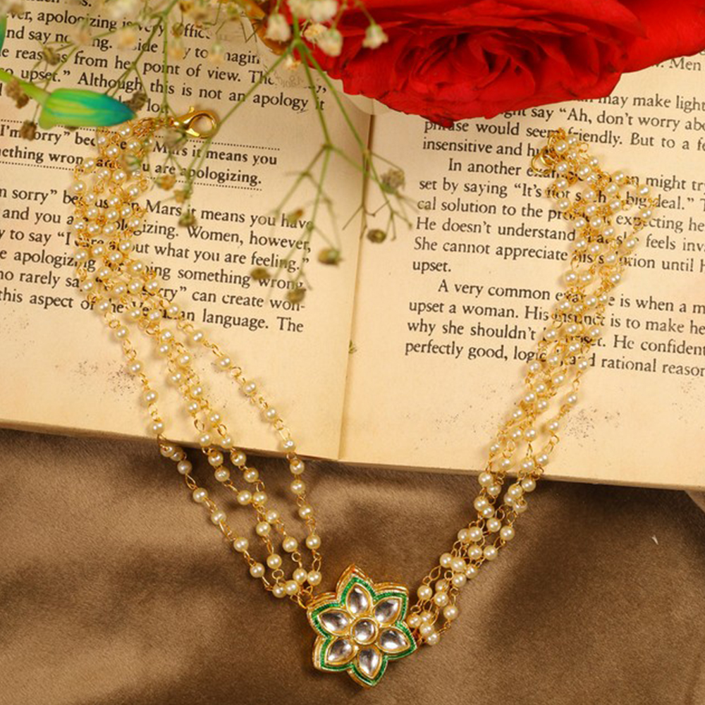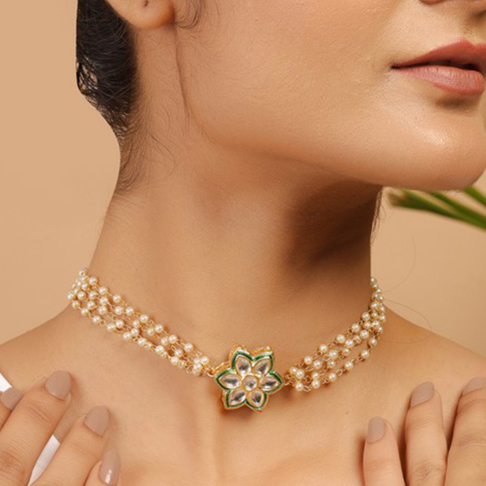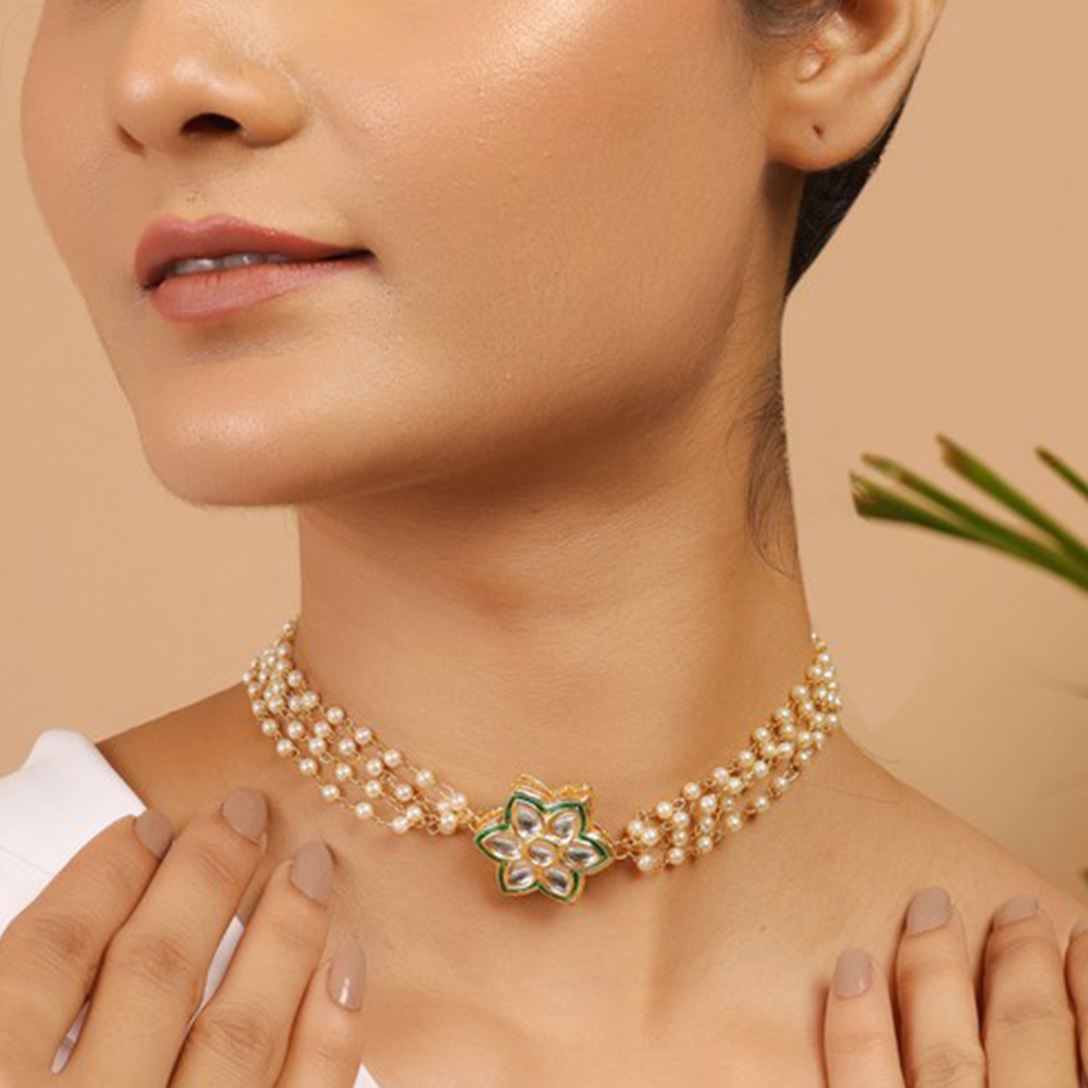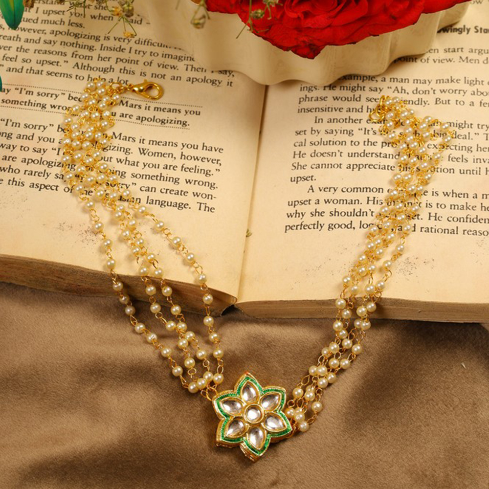 Celebrate individuality with this Pearl Kundan Flower Choker Necklace with Gold Tone. Featuring three strands of lustrous pearls centered around a floral pendant adorned with sparkling kundan stones and green enamel accents, this elegant choker is perfect for weddings, parties, and meaningful gifting. Packed & quality-checked by Indianshelf.