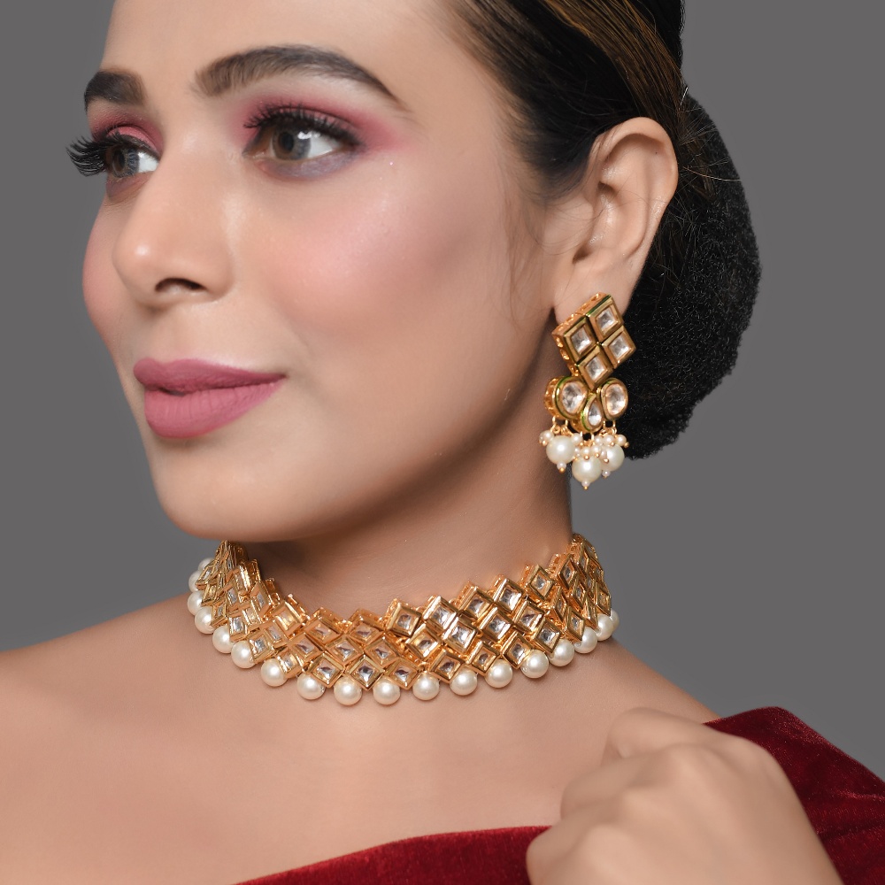 Elegant and structured, this mirror stone choker necklace set features a refined lattice-style arrangement that sits gracefully along the neckline. The design is finished with a soft row of pearl drops that add movement and a classic bridal touch. Paired with coordinating drop earrings, this set offers a balanced blend of tradition and contemporary styling. Choker Necklace Set Highlights Handcrafted with precision, this jewellery set reflects clean geometry softened by delicate pearl detailing. Lattice-inspired mirror stone choker design Single-line pearl drop detailing along the edge Matching handcrafted earrings included Lightweight structure for comfortable wear Finished using traditional hand-setting techniques Specs & Materials Material: Metal alloy with mirror-style stones and pearl accents Colour: Warm gold tone with reflective clear stones and ivory pearls Design: Structured choker with coordinated earrings Origin: Handmade in India and individually quality-checked Minor variations may occur due to handcrafted nature Adjustable tie-back closure for secure fit Styling & Gift Inspiration Perfect for weddings, receptions, and festive occasions Complements sarees, lehengas, and evening ensembles An elegant gift option for bridal trousseaus Adds definition without overpowering the outfit Care Guide Store in a dry pouch and avoid moisture, perfume, or chemicals. Clean gently with a soft cloth after use to maintain shine. Artisan Craftsmanship This jewellery set is entirely handmade using traditional methods. No machines are used, ensuring every piece carries a distinct artisanal character.