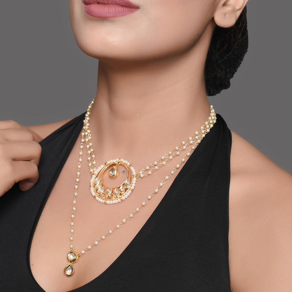 Delicate and refined, this pearl strand necklace features a graceful circular pendant accented with mirror-style stones. Designed for understated elegance, the necklace brings together soft pearl detailing and a minimal gold-tone structure, making it ideal for both festive wear and contemporary occasions. Necklace Highlights Handcrafted with attention to proportion and balance, this piece celebrates subtle luxury through clean lines and classic materials. Elegant circular pendant with mirror-style stone accents Single pearl drop suspended at the centre for gentle movement Fine pearl strand offering a lightweight, comfortable drape Minimal design suited for layering or standalone wear Created using traditional hand-assembly techniques Specs & Materials Material: Metal alloy with mirror-style stones and faux pearls Colour: Soft gold tone with ivory pearl detailing Design: Circular pendant necklace with delicate pearl chain Origin: Handmade in India and individually quality-checked Minor variations reflect authentic handcrafted character Adjustable closure for flexible length styling Styling & Gift Inspiration Perfect for intimate celebrations, festive gatherings, and elegant evenings Complements sarees, dresses, and modern fusion outfits An excellent gift choice for anniversaries and special milestones Adds refinement without overpowering the overall look Care Guide Store in a soft pouch away from moisture. Avoid direct contact with perfumes and chemicals. Wipe gently with a dry cloth after use to maintain shine. Artisan Craftsmanship This necklace is entirely handcrafted using traditional techniques. No machines are used in the making, ensuring each piece carries its own unique artisanal identity.